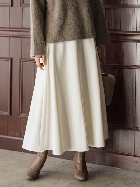 柔らかタッチで温かみのある尾州産地素材を使用したフレアスカート。表裏両面に起毛をかけたあたたかみのある素材感で、冬のコーディネートにぴったりです。縦横2WAYストレッチで動きやすく、快適な着心地を実現します。エレガントに揺れるミモレ丈フレアシルエットにセンターステッチを施し、さりげないデザインポイントに。フロントはフラットでクリーンな印象。後ろファスナー仕様で着脱も簡単です。カラーはオフホワイト・ブラック・キャメルのベーシック展開で、どんなトップスにも合わせやすい万能スカートです。
