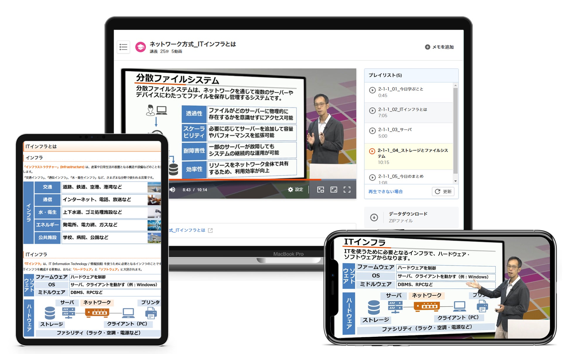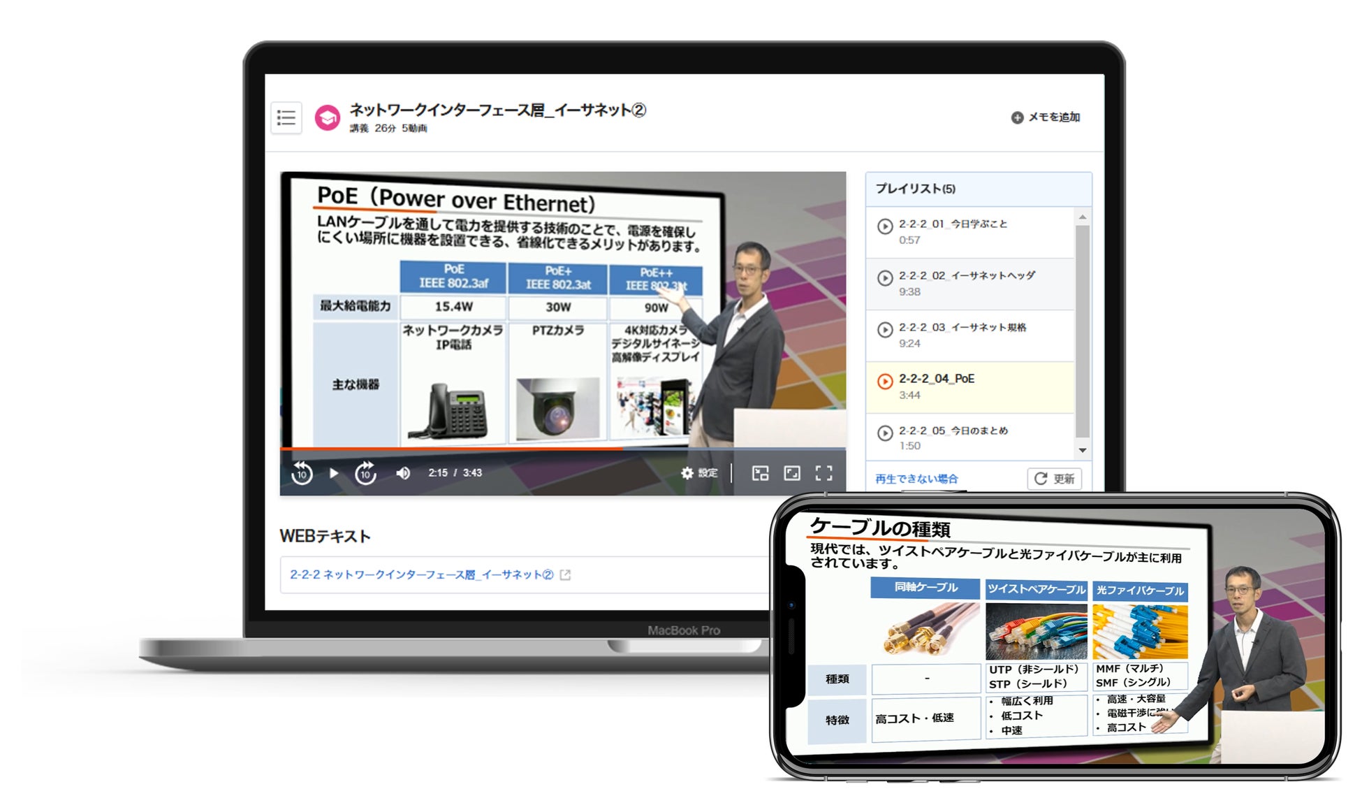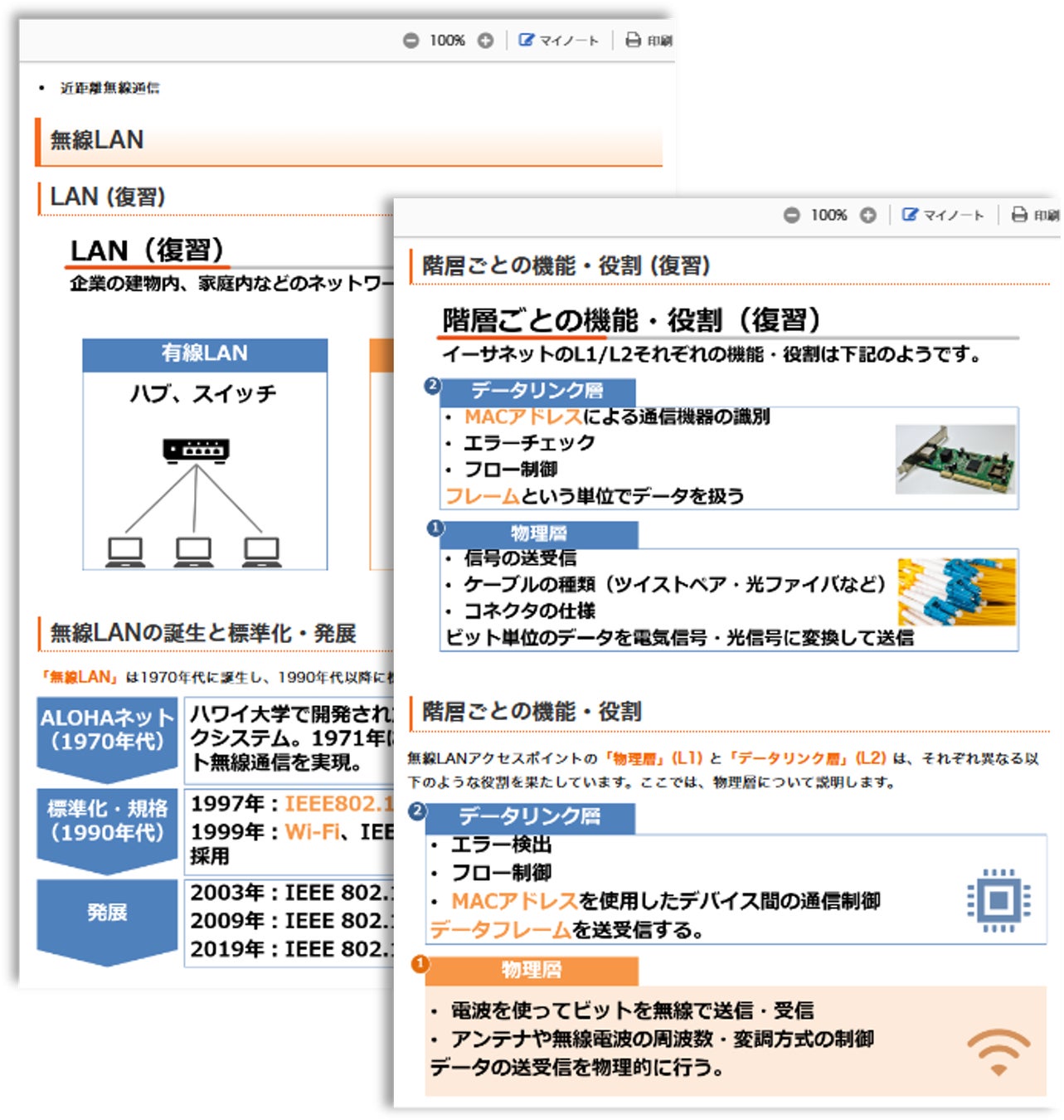 初めてネットワークスペシャリスト試験に挑戦される方でも、視覚的にネットワークの専門用語の内容や関係性を理解しやすいように、テキストや動画講義には、図解での説明を多く採用しました。文章で読んでも分かりにくい専門用語や複雑なロジックも、「図表やイラストを駆使したスライド」を用いて五感を使って学習していただくことで、テレビの情報番組を見るように分かりやすく楽しく学習できます。