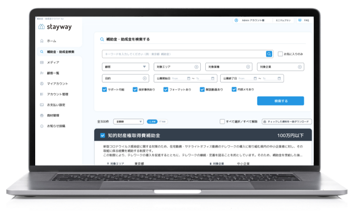 また、課題が多い補助金・助成金領域に対しては、全国の地域金融機関/事業会社と連携しながら、テクノロジーを用いて効率化を進める補助金テックを推進しており、金融庁や日経新聞の選ぶFintecスタートアップに選抜されております(https://stayway.co.jp/news/1367/)
