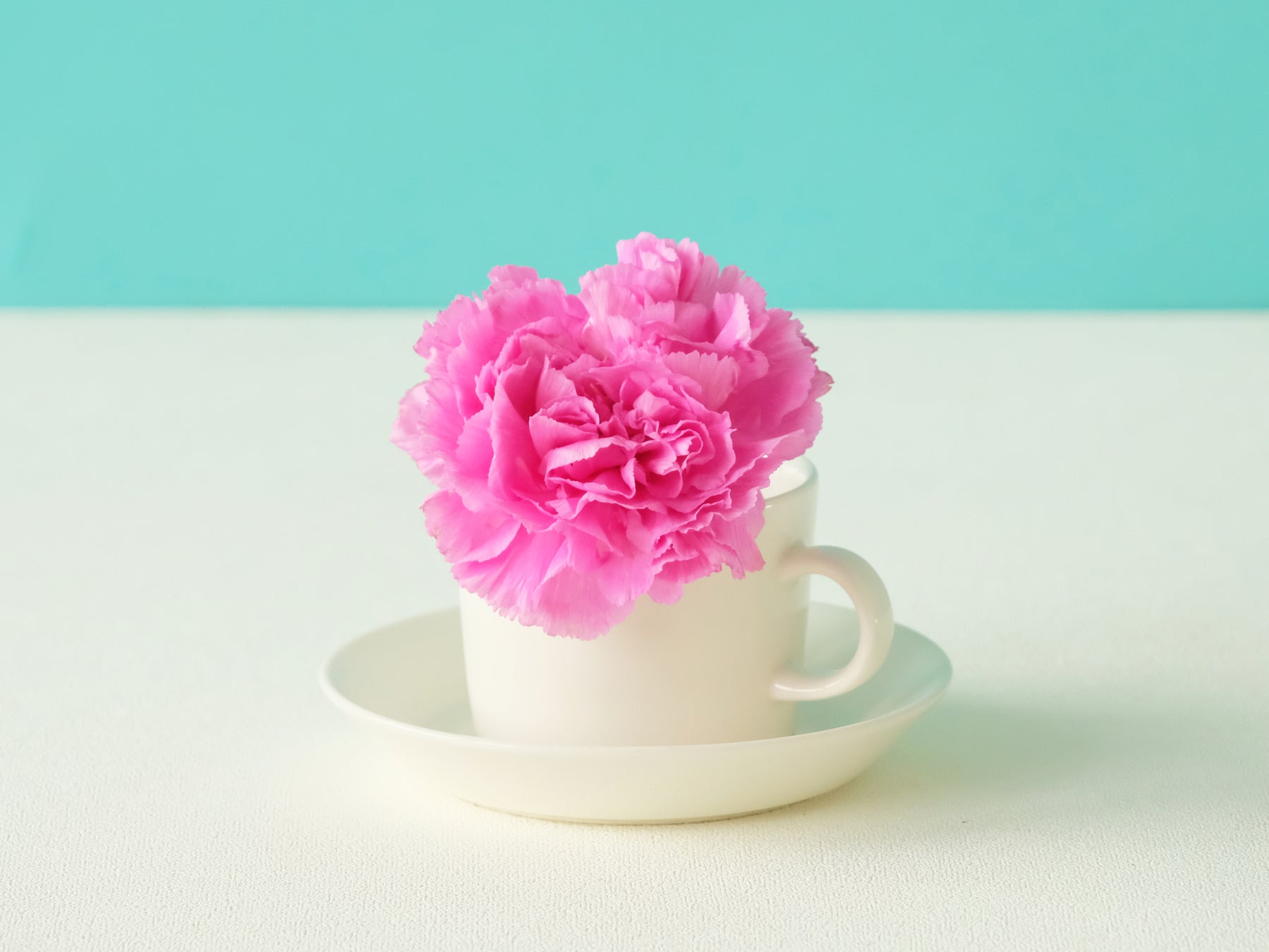 右上:ふんわりしたカーネーションはカップ&ソーサ―にもぴったり。短く折れてしまった時のアレンジとしてもおすすめです。