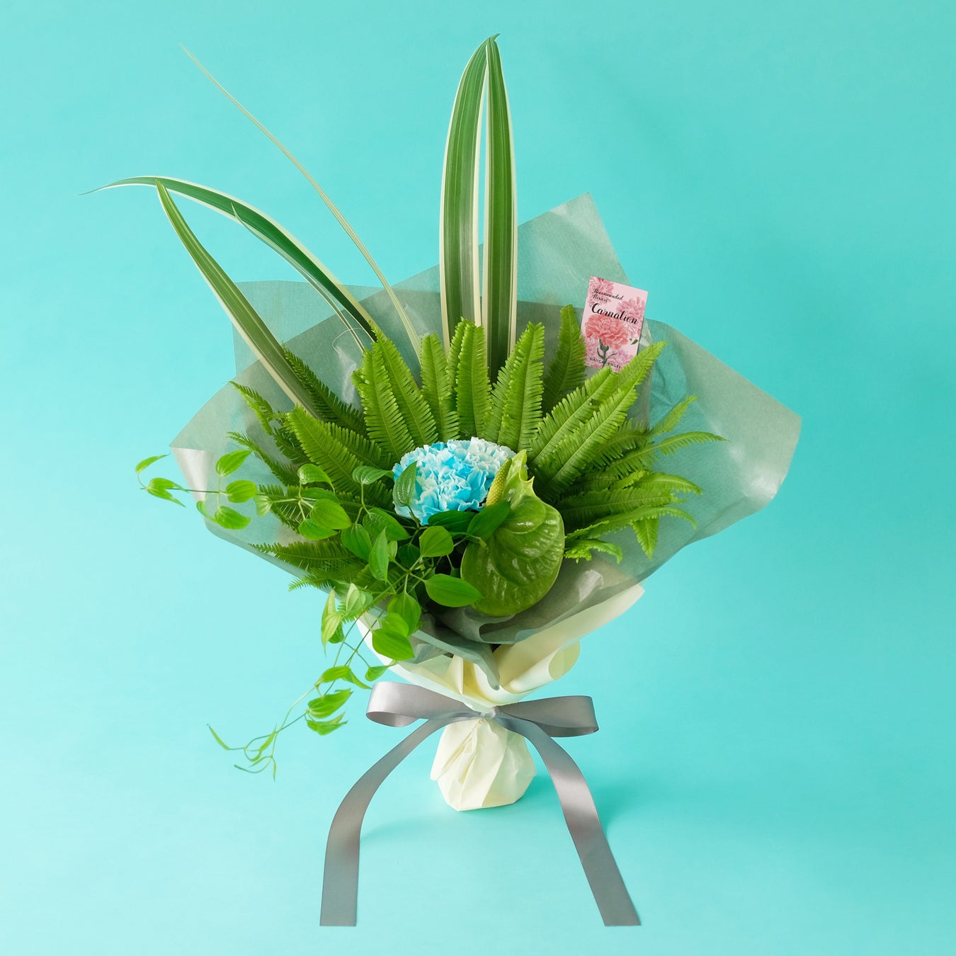 『カーネーションとグリーンのブーケ』ショップおすすめのカーネーションとたっぷりのグリーンを合わせた初夏を感じるフレッシュなブーケです。性別を問わない贈り物にも、ご自宅のインテリアグリーンとしてもおすすめです。