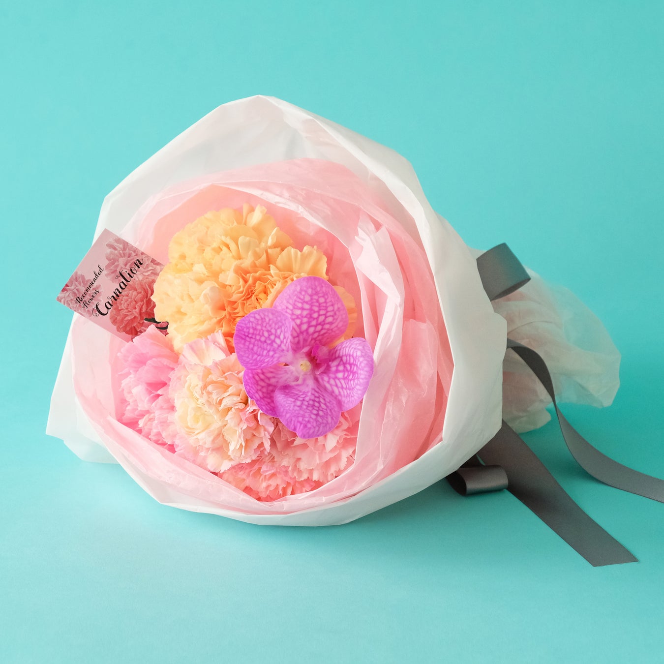 ショップおすすめのカーネーションに「優美」や「上品な美しさ」の花言葉を持つ一輪のバンダをアクセントに加えました。お誕生日のプレゼントや母の日のギフトにもおすすめです。