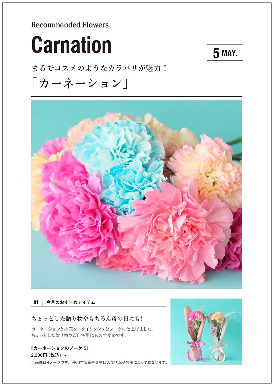 そんなカーネーションは、まるで口紅やアイシャドウのような、ニュアンスのある花色が豊富に揃う花です。フリルの花びらがたくさん重なって1輪でもまるでブーケのような姿や、ほんのりとしたやさしい香りも魅力!しかも花屋さんで扱う花の中でも日持ちはトップクラスなので、気温が高くなりはじめる季節でも気軽に楽しめる旬の花です。5月が旬のカーネーション、コスメを選ぶような感覚で楽しんでみませんか。
