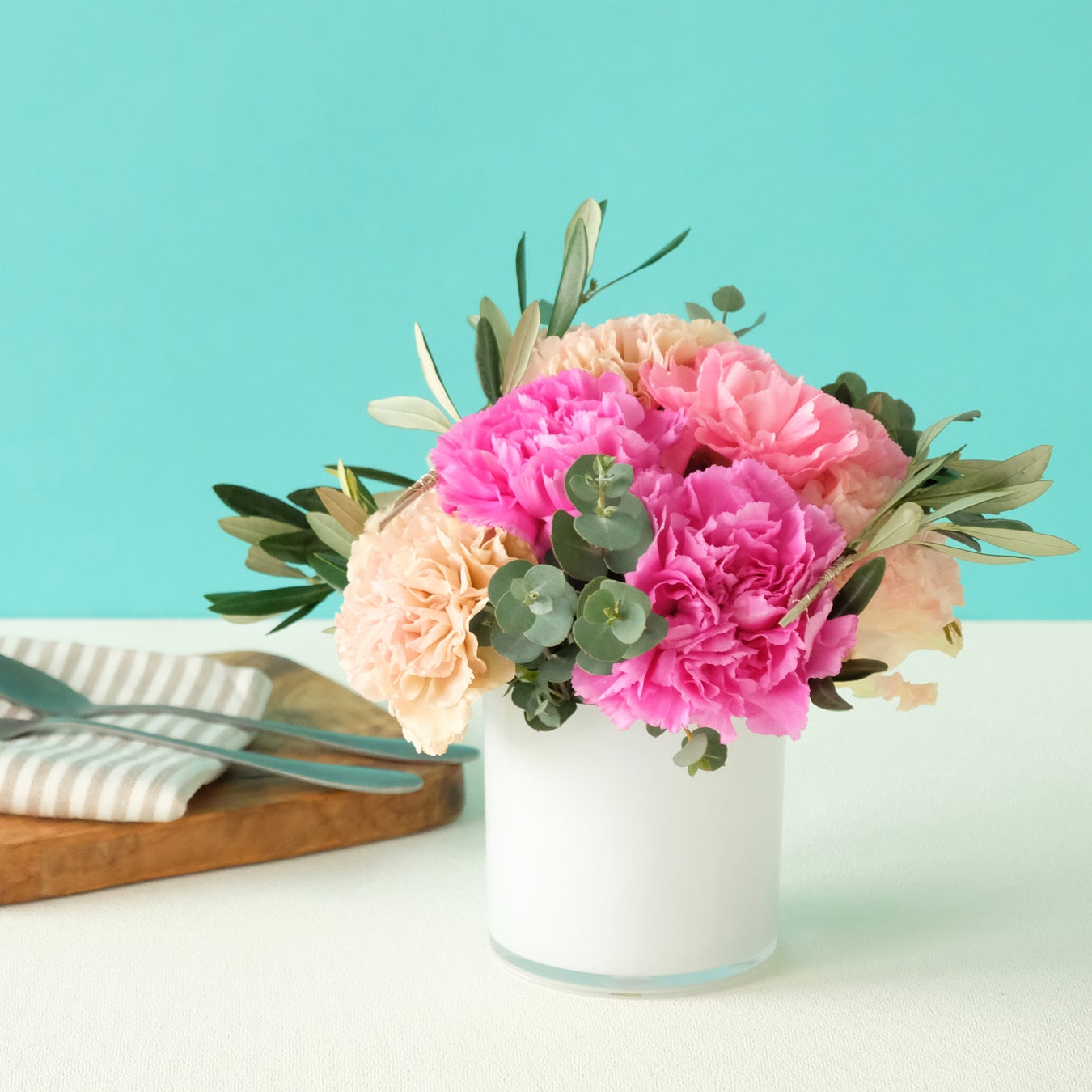 ショップおすすめのカーネーションをぎゅっと詰め込んだアレンジメント。器付きのためそのまま飾って楽しめます。ギフトはもちろん、ご自宅用にもおすすめです。
