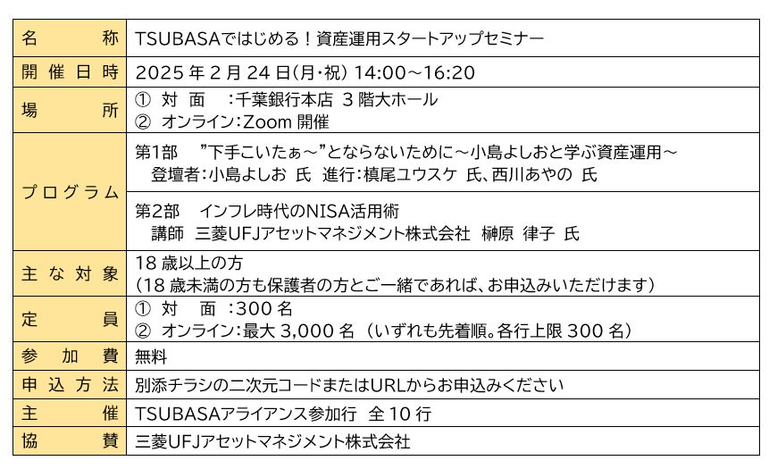 千葉銀行(頭取 米本 努)は、2025年2月24日(月・祝)、TSUBASAアライアンス※で連携する10行と「TSUBASAではじめる!資産運用スタートアップセミナー」を共催します。