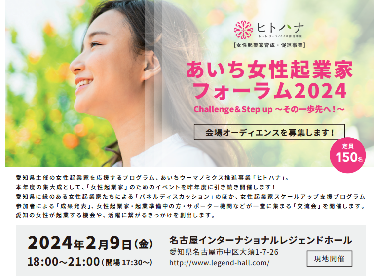 女性起業家育成・促進事業「ヒトハナ」「あいち女性起業家フォーラム2024」を2/9(金)に開催。参加者募集。