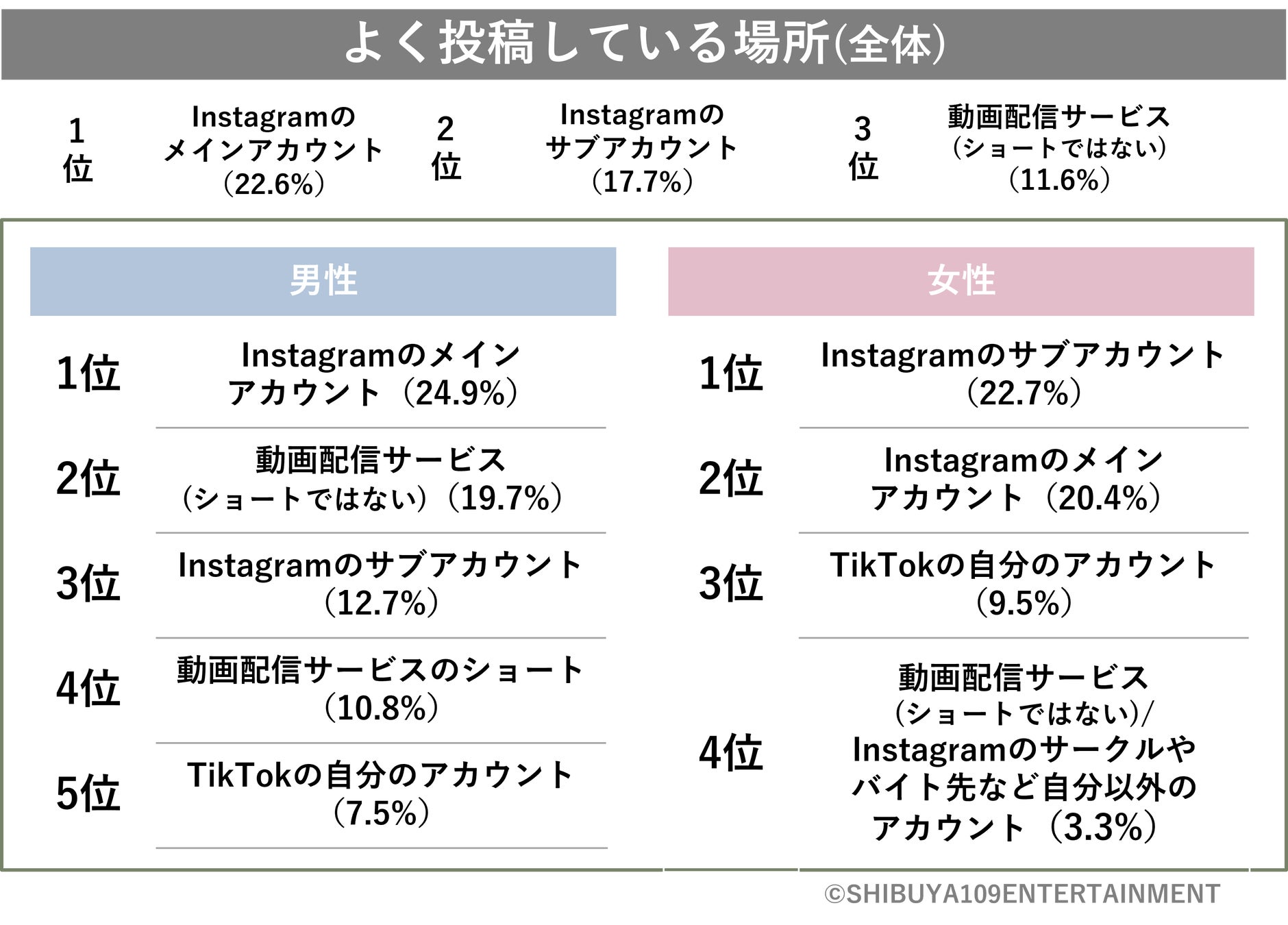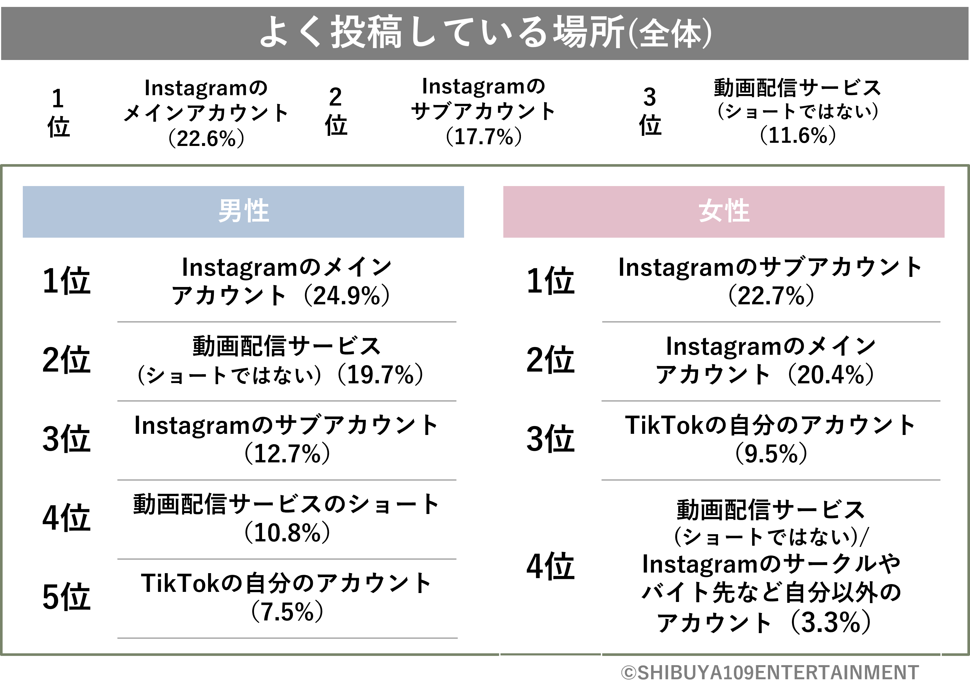 動画をよく投稿している場所※図13として、全体では「Instagramのメインアカウント(22.6%)」「Instagramのサブアカウント(17.7%)」「動画配信サービス(ショートではない)(11.6%)」という回答が多くなりましたが、男性は「Instagramのメインアカウント(24.9%)」「動画配信サービス(ショートではない)(19.7%)」「Instagramのサブアカウント(12.7%)」、女性は「Instagramのサブアカウント(22.7%)」「Instagramのメインアカウント(20.4%)」「TikTokの自分のアカウント(9.5%)」※図13と、順位に違いが生まれています。