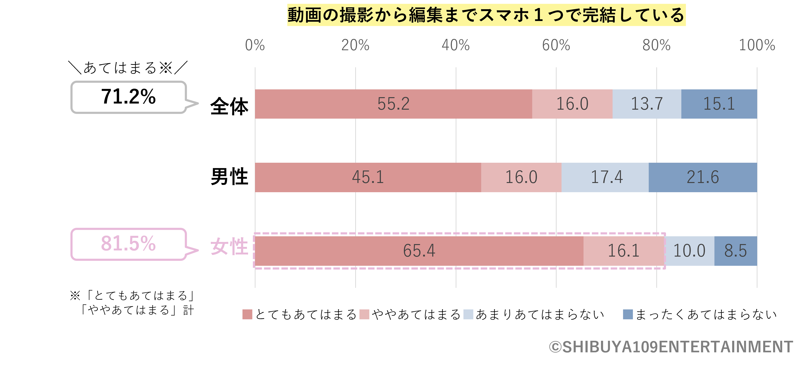 実際に動画を作る上で、「動画の撮影から編集までスマホ1つで完結している」※図10と回答したのは71.2%となりました。特に女性は81.5%と非常に高い割合になっています。