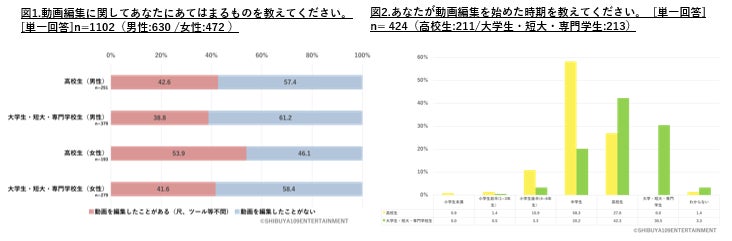 動画編集経験について聞いてみると、女子高校生以外の属性では約4割程度が「動画を編集したことがある」※図1と回答しました。女子高校生では動画編集経験者は53.9%※図1となり、半数以上が動画を編集したことがあることがわかります。動画編集を始めた時期※図2としては、高校生が「中学生(58.3%)」、大学生・短大・専門学校生が「高校生(42.3%)」と回答し、数年単位で動画編集に慣れ親しんでいます。