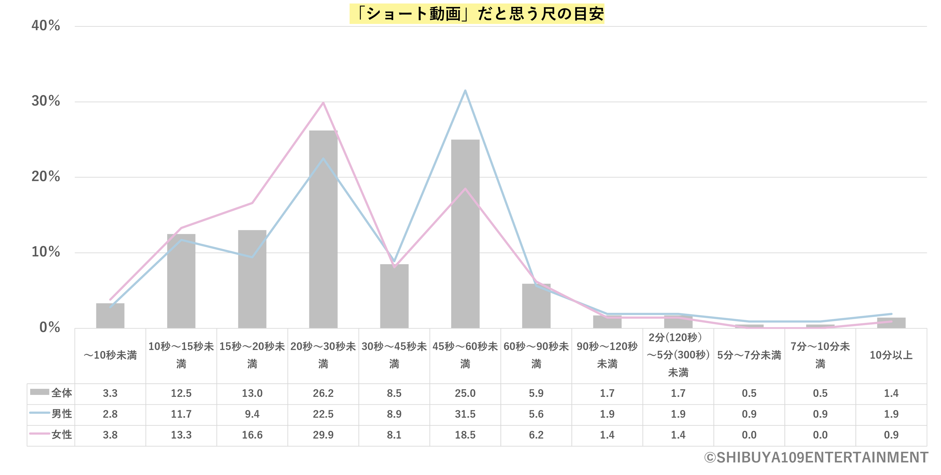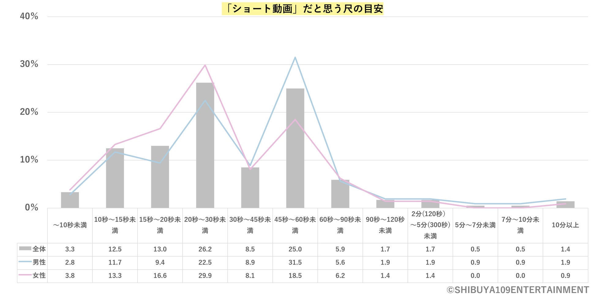 動画編集方法について知る情報源についても、男性は「動画配信サービス(ショート以外)(42.3%)」が最も多くなったのに対して、女性は「TikTok(42.2%)」※図14が最も多くなっています。ショート動画だと思う尺の目安※図15についても、男性は「45~60秒未満」 が31.5%で最も多くなったのに対し、女性は「20~30秒未満」が29.9%が最も多くなり、女性の方が「ショート動画」について少し短いものをイメージしていることがわかります。同じ短い動画についての話題でも、男女でイメージする長さや投稿するプラットフォームが異なっていることがわかります。