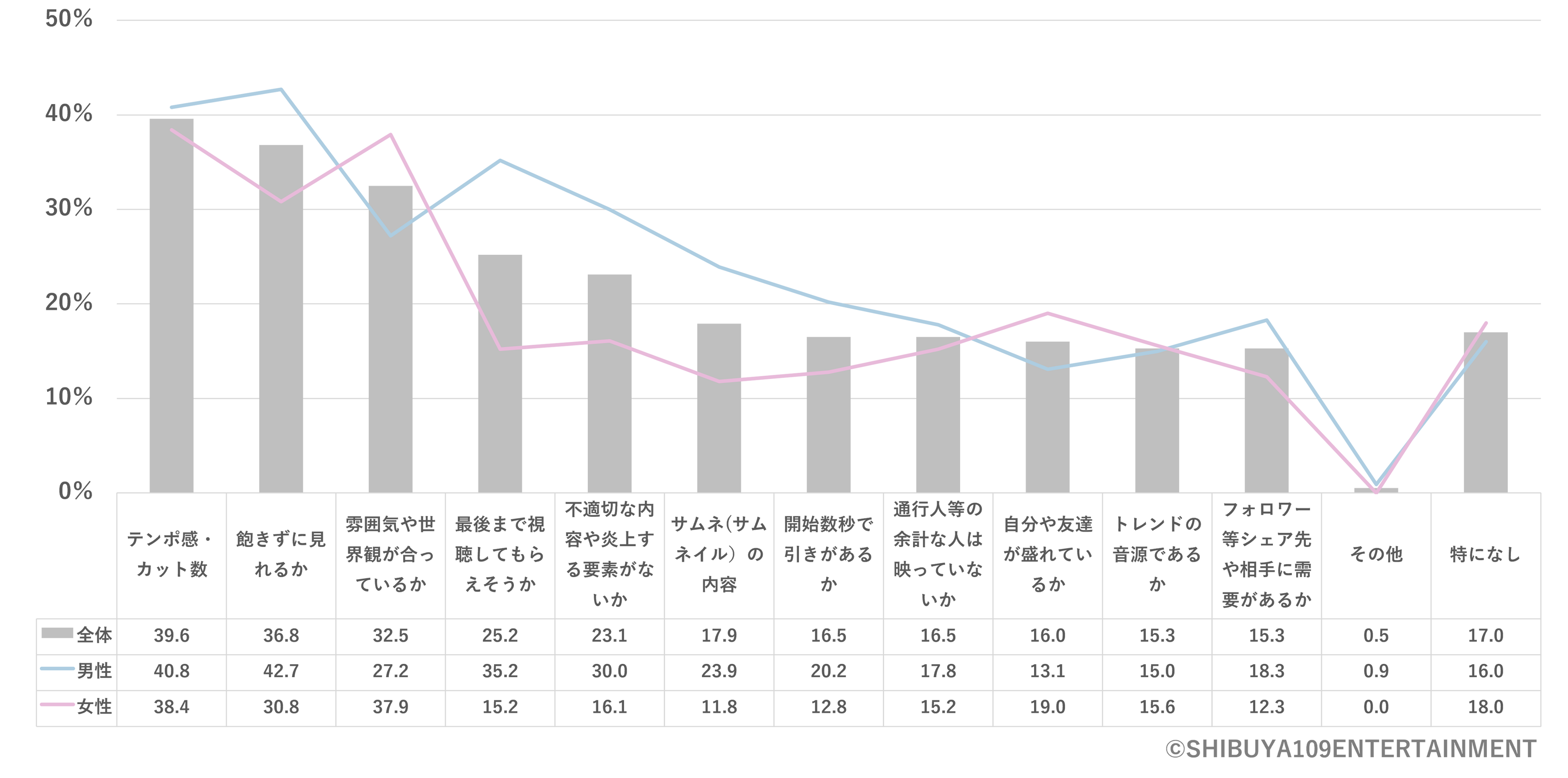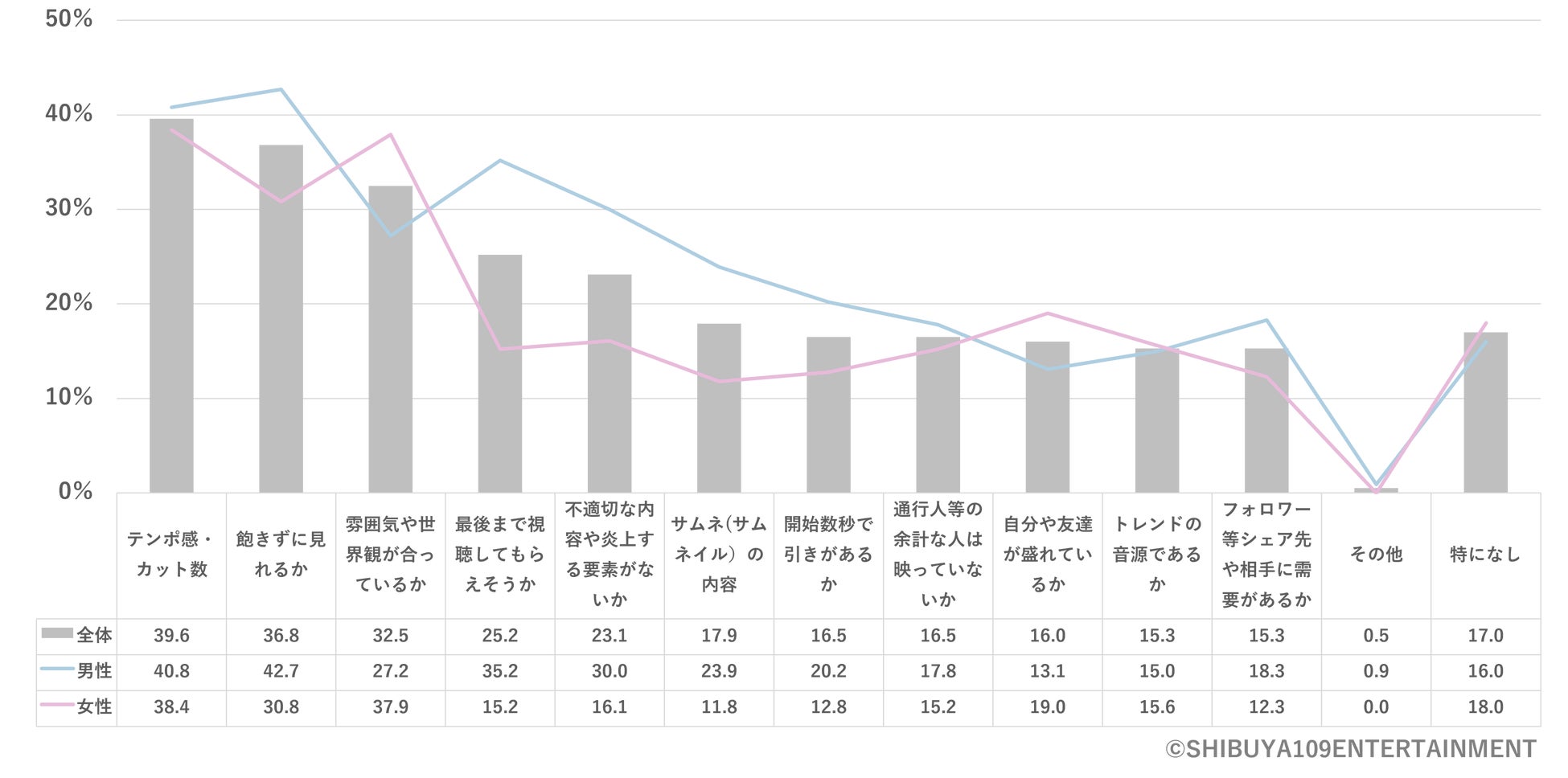 動画編集をするにあたり、「テンポ感・カット数(39.6%)」「飽きずに見られるか(36.8%)」「雰囲気や世界観が合っているか(32.5%)」が意識していることとして上位となりました。また、ショート動画の定義となる尺や、編集時間、投稿場所には男女差も見られました。