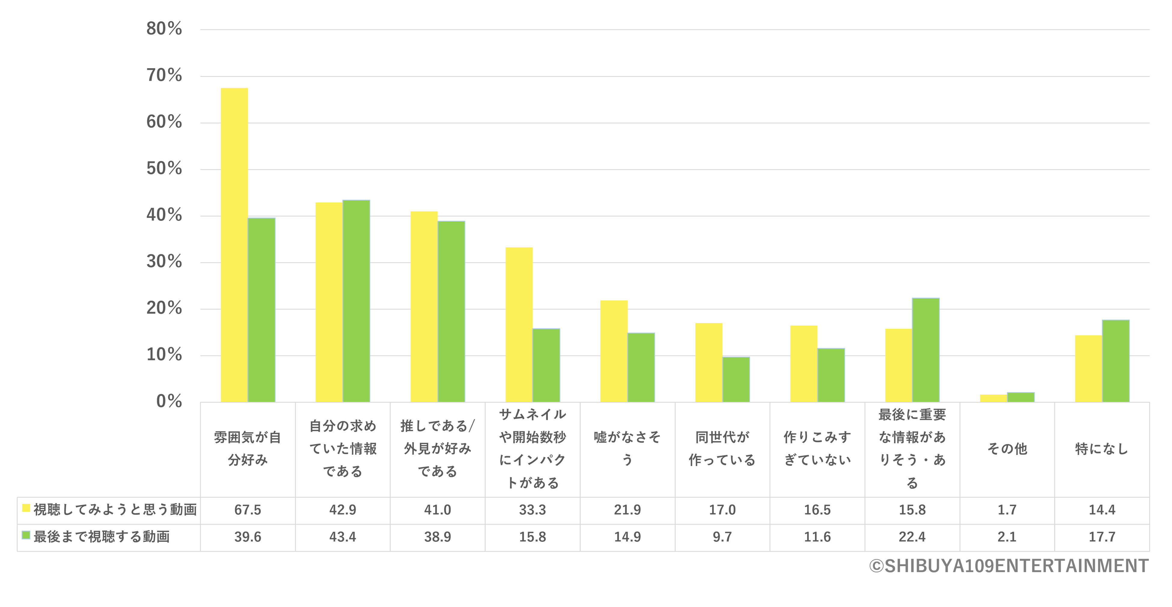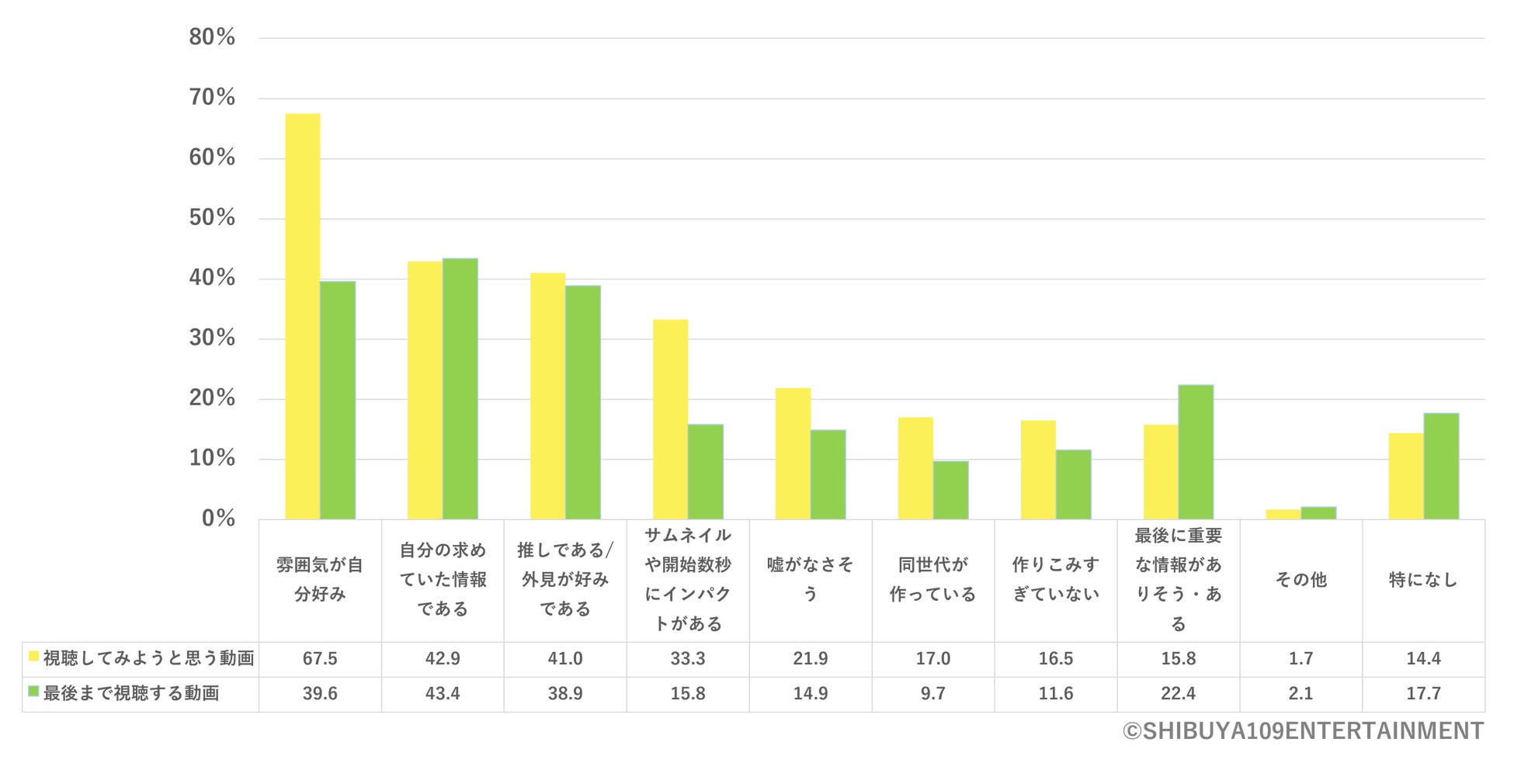 自分が視聴してみようと思う動画については「雰囲気が自分好み(67.5%)」「自分の求めていた情報である(42.9%)」「推しである/外見が好みである(41.0%)」が重視されており、最後まで視聴する動画についても「自分の求めていた情報である(43.4%)」「雰囲気が自分好み(39.6%)」「推しである/外見が好みである(38.9%)」※図17と似通った要素が重視されていることがわかります。