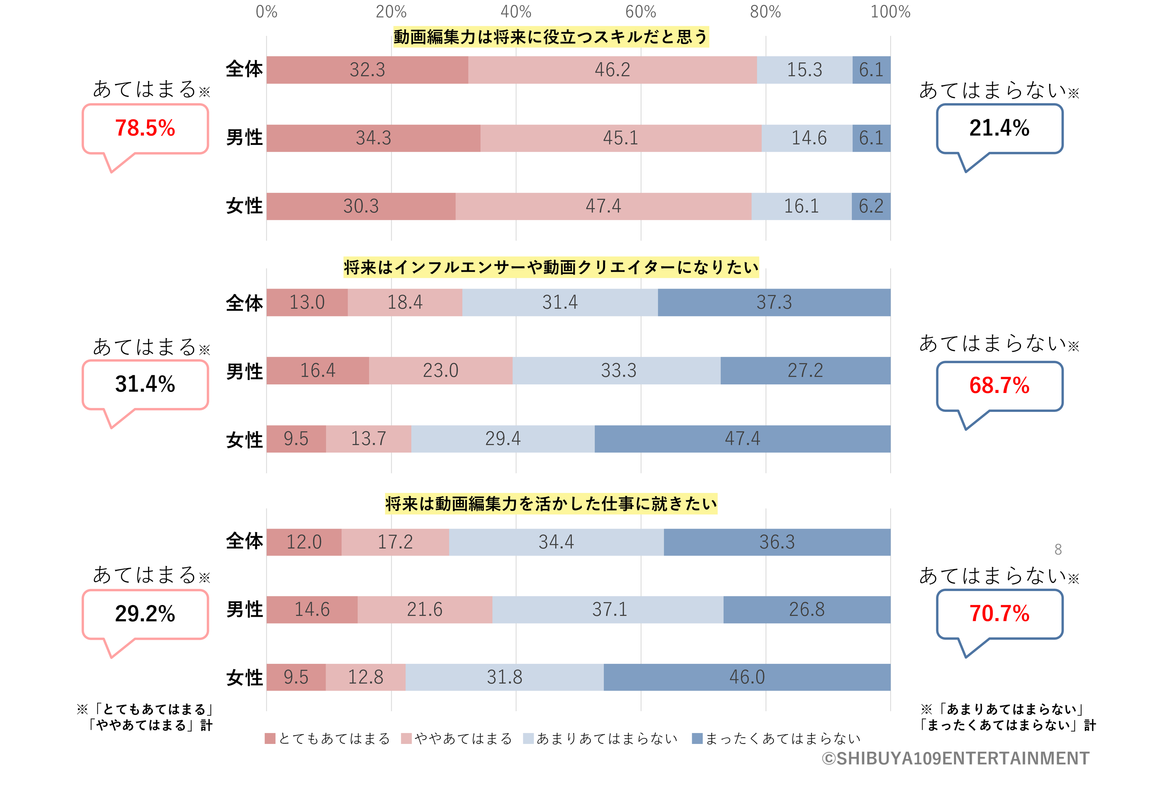 また、「動画編集力は将来役立つスキルだと思う」と回答したのは約8割になりましたが、「将来はインフルエンサーや動画クリエイターになりたい(31.4%)」「将来は動画編集力を活かした仕事に就きたい(29.2%)」※図7という回答は約3割に留まっています。Z世代にとって、動画編集は仕事に活かすというよりも、日常生活の中で生かせるスキルだと考えているようです。