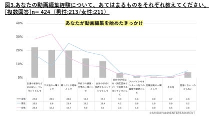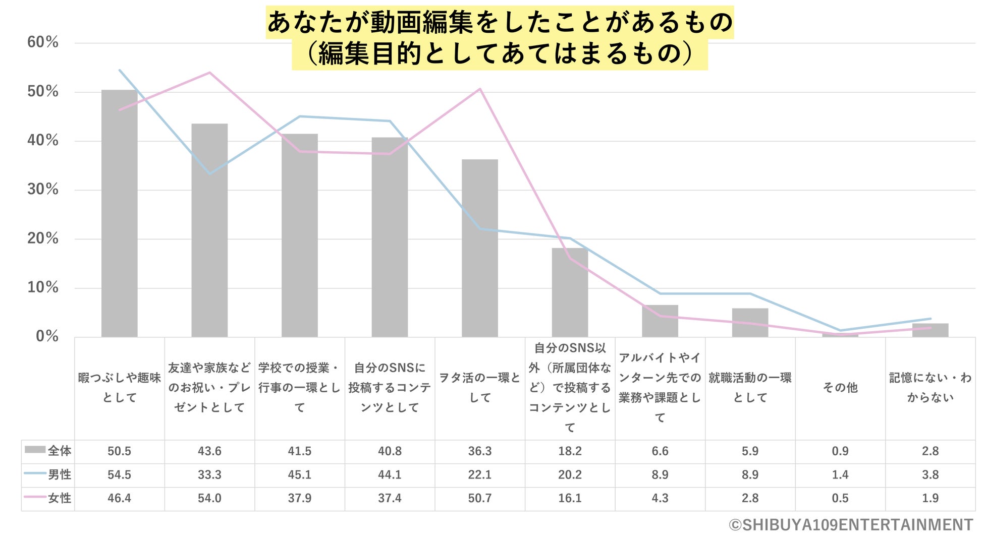 動画編集を始めたきっかけは「友達や家族などのお祝い・プレゼントとして(22.6%)」が最も多く、動画がコミュニケーションツールとして身近なものとなっているようです。また、趣味、学校行事、ヲタ活など様々な場面で動画を用いたコミュニケーションが浸透していることもわかりました。