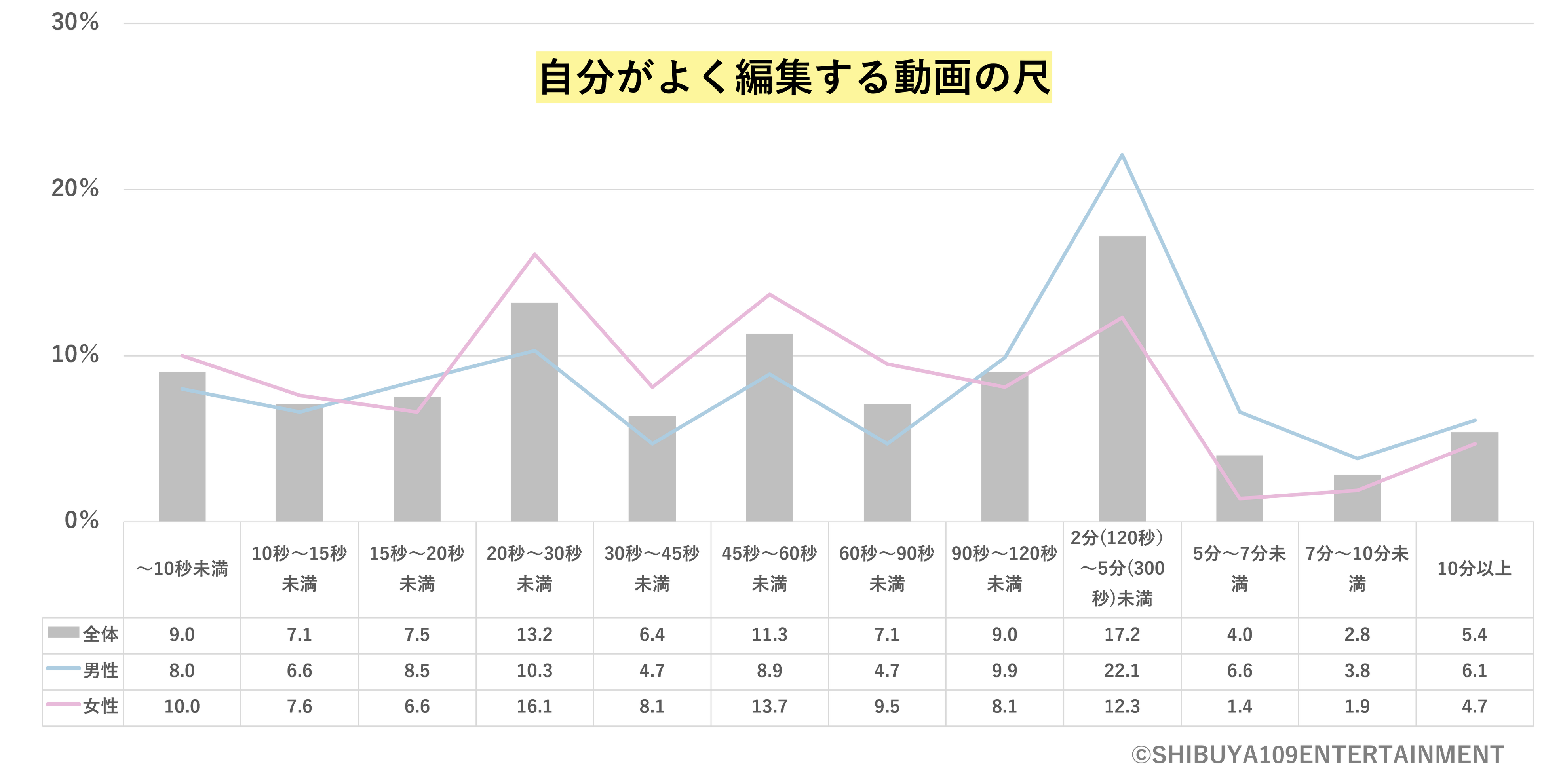 編集する動画の尺についても男女で違いがいくつか見られました。まず、自分がよく編集する動画の尺※図12は、全体では「2分〜5分未満(17.2%)」が最も多い回答となり、男性も同様に「2分〜5分未満」が22.1%で最多となった一方、女性は「20~30秒未満」が16.1%と最も多く、全体と比較すると短めである傾向がわかります。