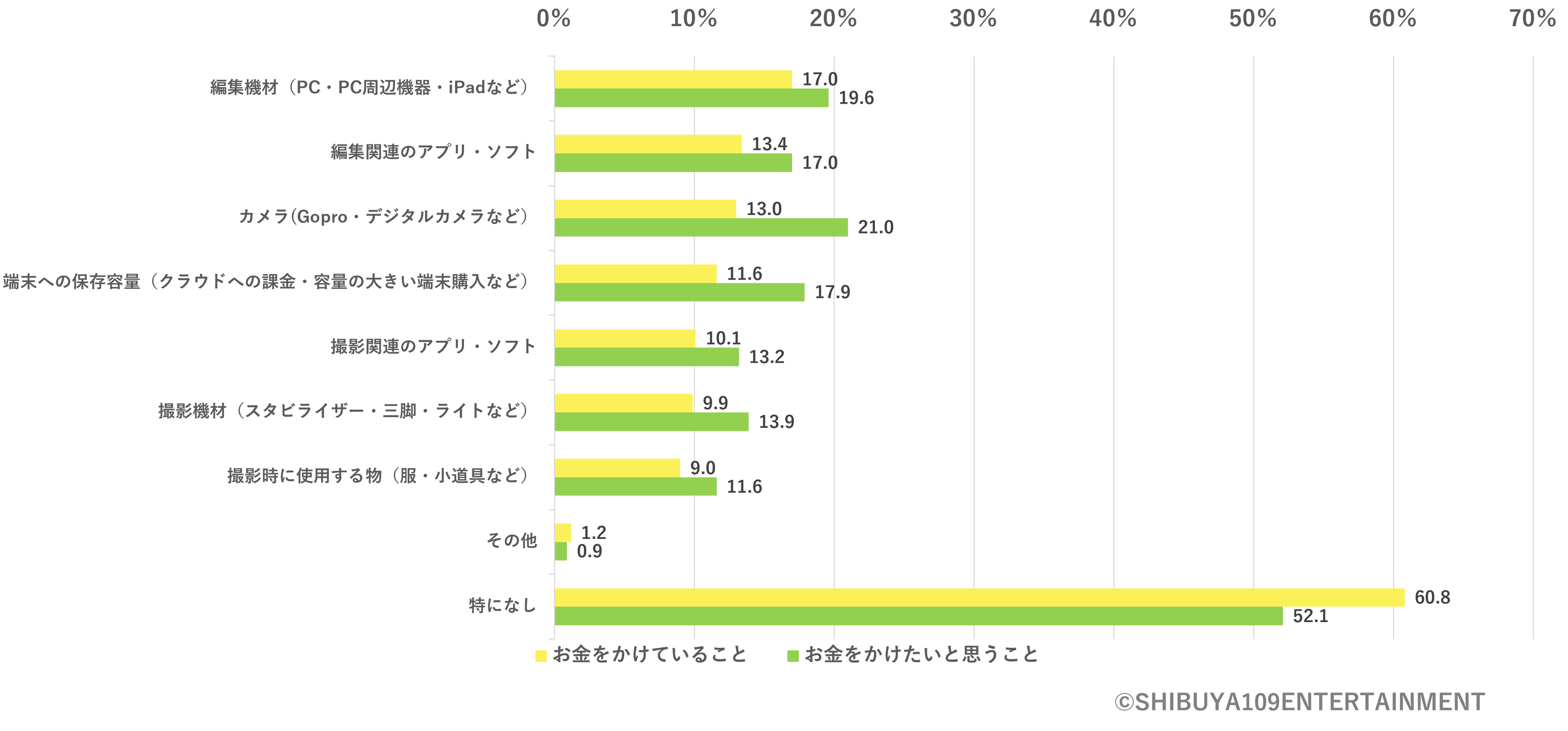 動画編集にかけているお金に関して、全体では「お金は使わない(55.0%)」※図8が最多の回答でした。お金をかけていること「特になし(60.8%)」、お金をかけたいこと「特になし(52.1%)」※図9という回答が最も多いことから、動画編集はお金をかけずに日常的に楽しむアクティビティになっているようです。