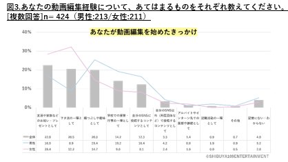 実際に、動画編集を始めたきっかけ※図3を聞いてみると、「友達や家族などのお祝い・プレゼントとして(22.6%)」「ヲタ活の一環として(20.5%)」「暇つぶしや趣味として(20.0%)」という回答が多くなっています。
