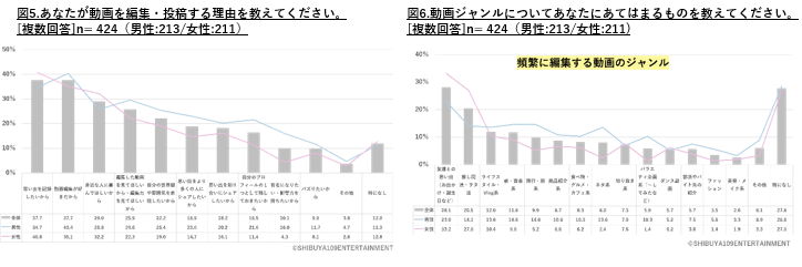 動画編集をしたことがあるもの(編集目的としてあてはまるもの)※図4についても「暇つぶしや趣味として(50.5%)」「友達や家族などのお祝い・プレゼントとして(43.6%)」「学校での授業・行事の一環として(41.5%)」「自分のSNSに投稿するコンテンツとして(40.8%)」「ヲタ活の一環として(36.3%)」が上位となり、日常の様々な場面で動画を用いたコミュニケーションが浸透していることがわかりました。