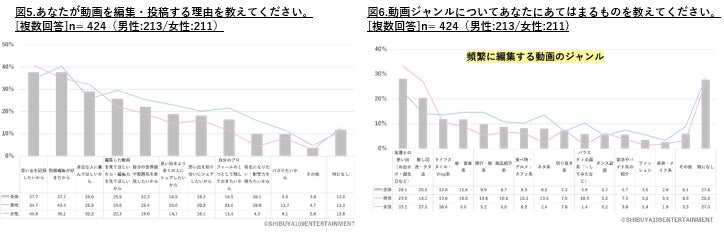 図7.動画編集や視聴に関してあなたにあてはまるものをそれぞれお答えください。 [単一回答] n= 424(男性:213/女性:211)