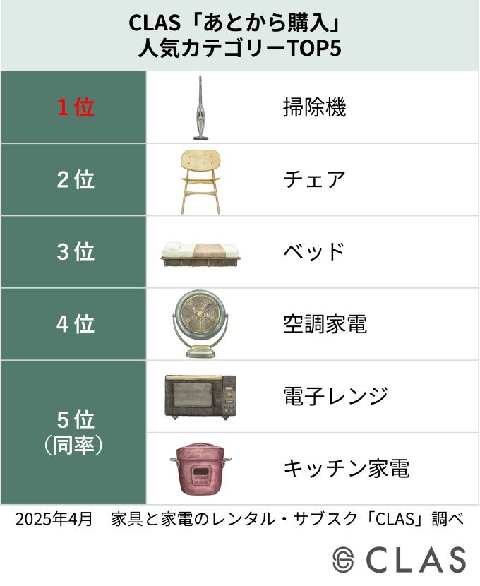 株式会社クラス(本社:東京都目黒区、代表取締役社長:久保 裕丈)が運営する、循環型の家具と家電のレンタル・サブスク「CLAS(クラス)」は、2024年7月より提供し、ご好評いただいている「あとから購入」を、この度正式にリリースいたしました。