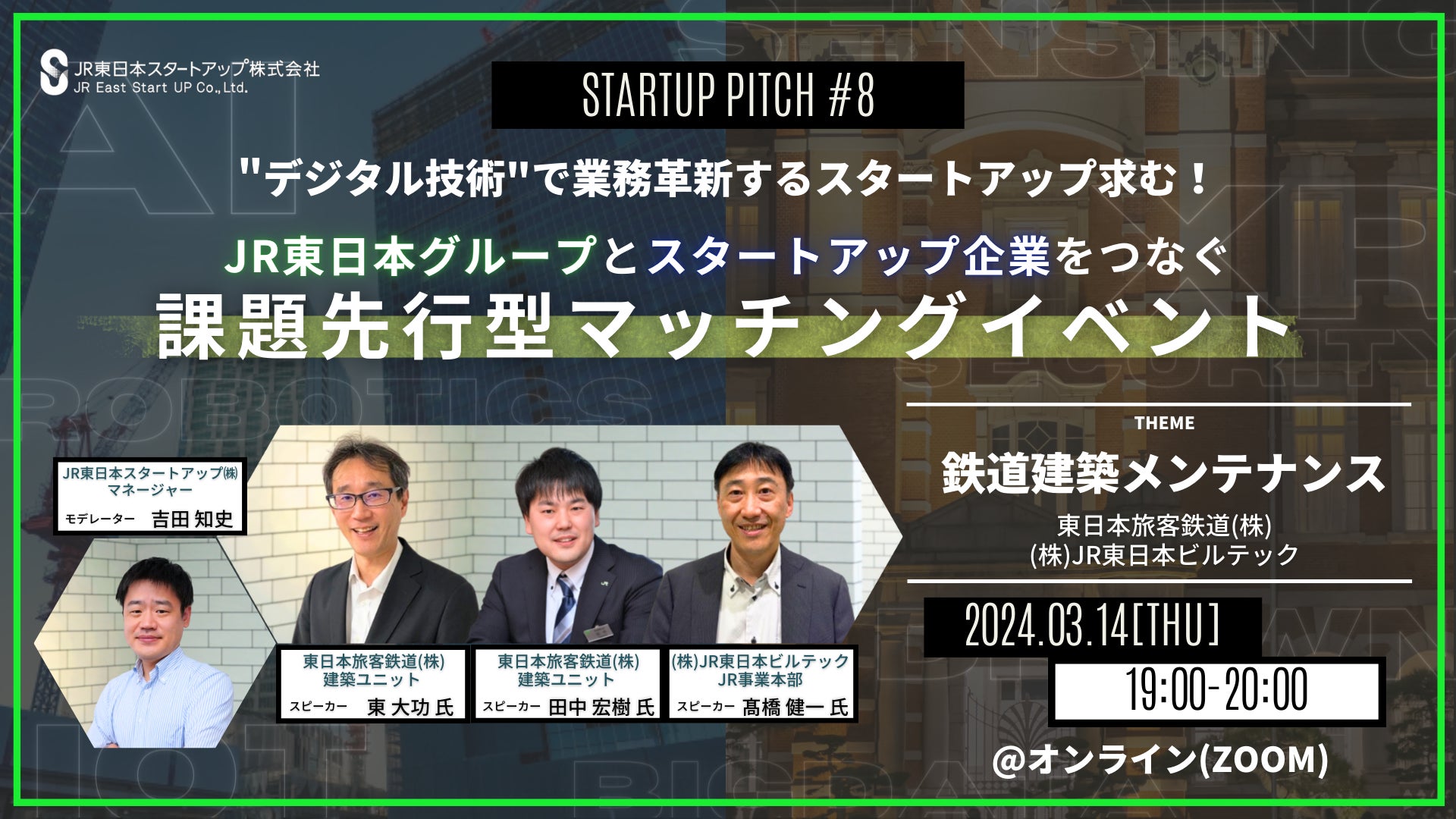 STARTUP PITCHはJR東日本グループからJR東日本グループの抱える課題を提示して、優れたアイデアや先端技術を持つスタートアップとのマッチングを推進するオンラインイベントです。
