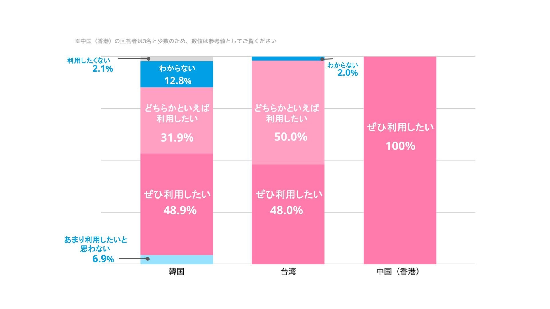 台湾では「ぜひ利用したい」48.0%と「どちらかといえば利用したい」50.0%を合わせ、98.0%が前向きな意向を示しました。