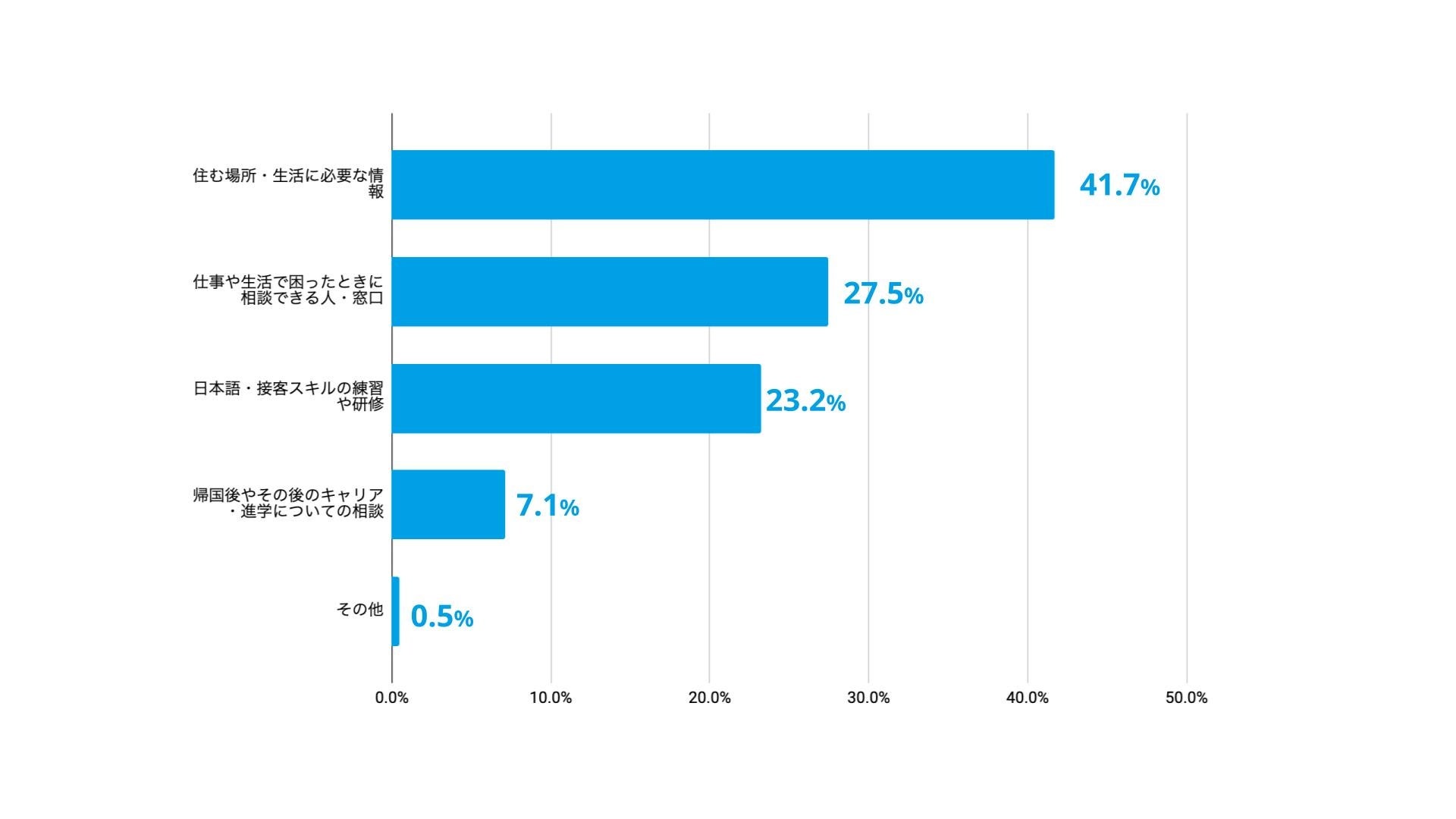 日本でのワーキングホリデー中にどのような支援があると安心かを尋ねたところ、最も多かったのは「住む場所・生活に必要な情報」(41.7%)でした。次いで「仕事や生活で困ったときに相談できる人・窓口」(27.5%)、「日本語・接客スキルの練習や研修」(23.2%)が続きました。