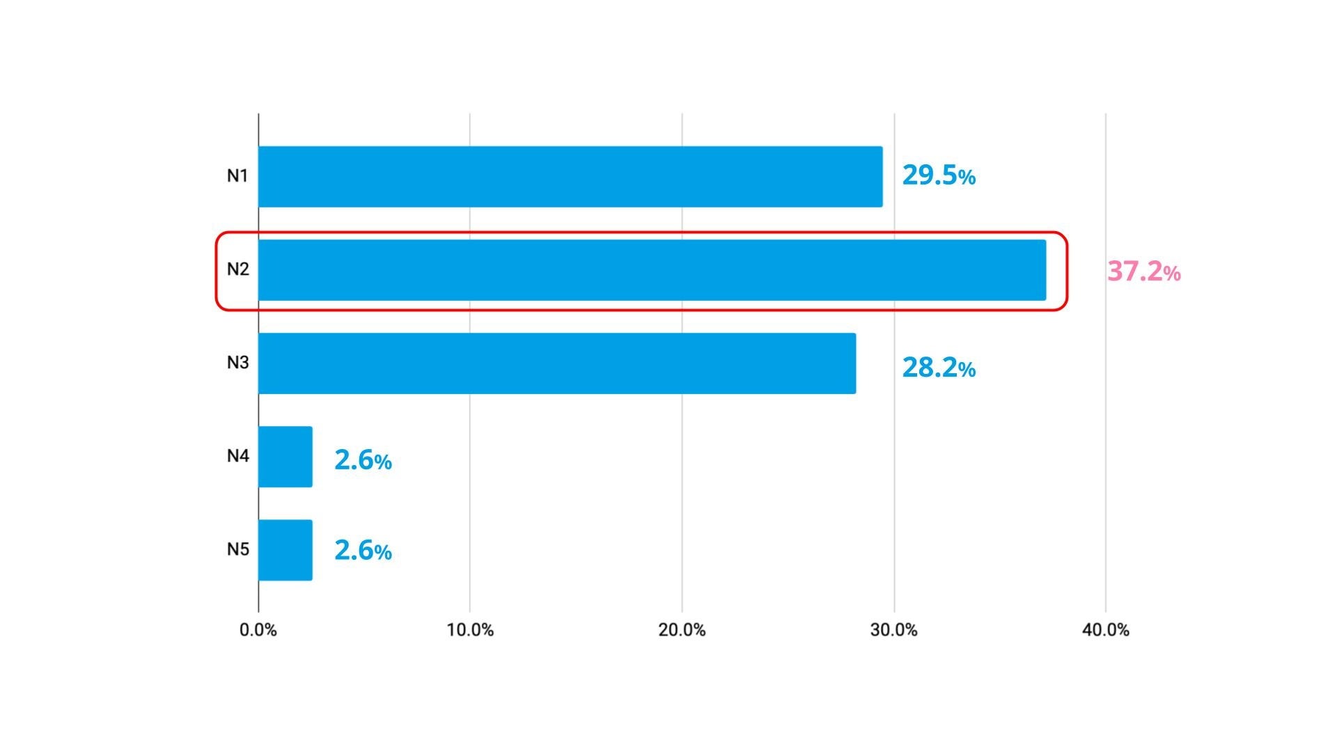 日本語能力試験(JLPT)の資格を持っていると回答した方に、取得級を尋ねたところ「N2」が最も多く37.2%となりました。次いで「N1」が29.5%、「N3」が28.2%で、いずれも同程度の割合となっています。「N4」「N5」はそれぞれ2.6%にとどまりました。