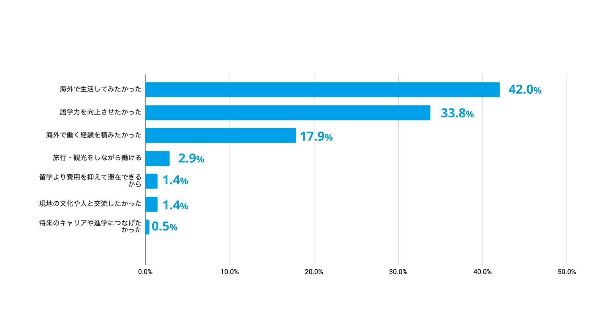 一方で「旅行・観光をしながら働けるから」(2.9%)や「留学より費用を抑えて滞在できるから」(1.4%)、「現地の文化や人と交流したかった」(1.4%)、「将来のキャリアや進学につなげたかった」(0.5%)といった理由は少数にとどまりました。