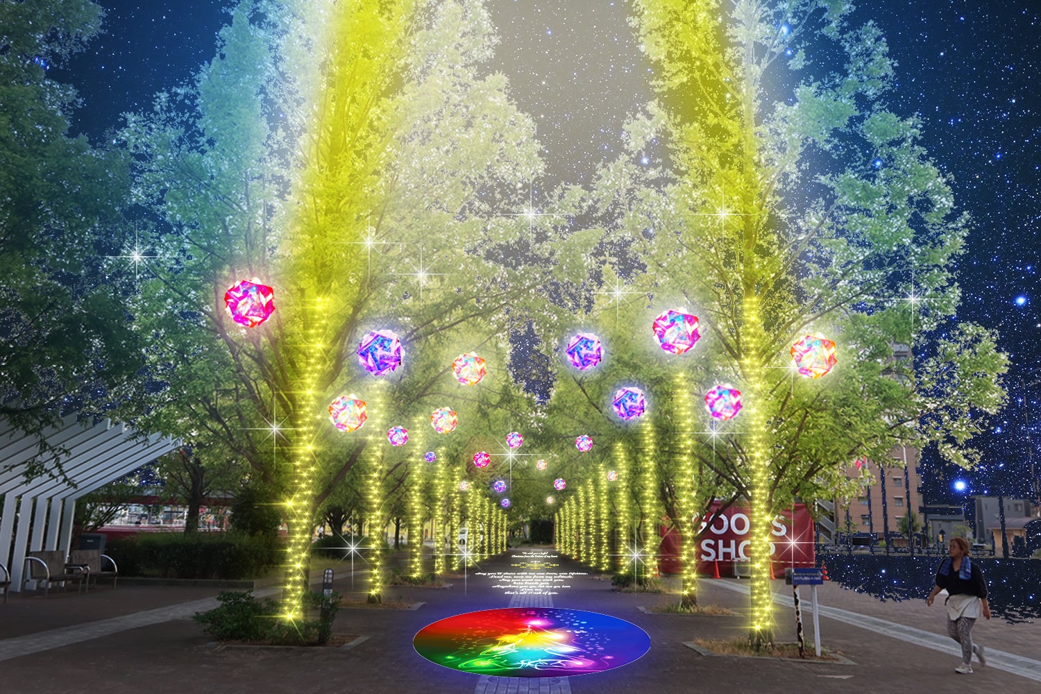 広場中央のLEDツリーが30分に一度、音楽に合わせて光る特別ショーを実施します。