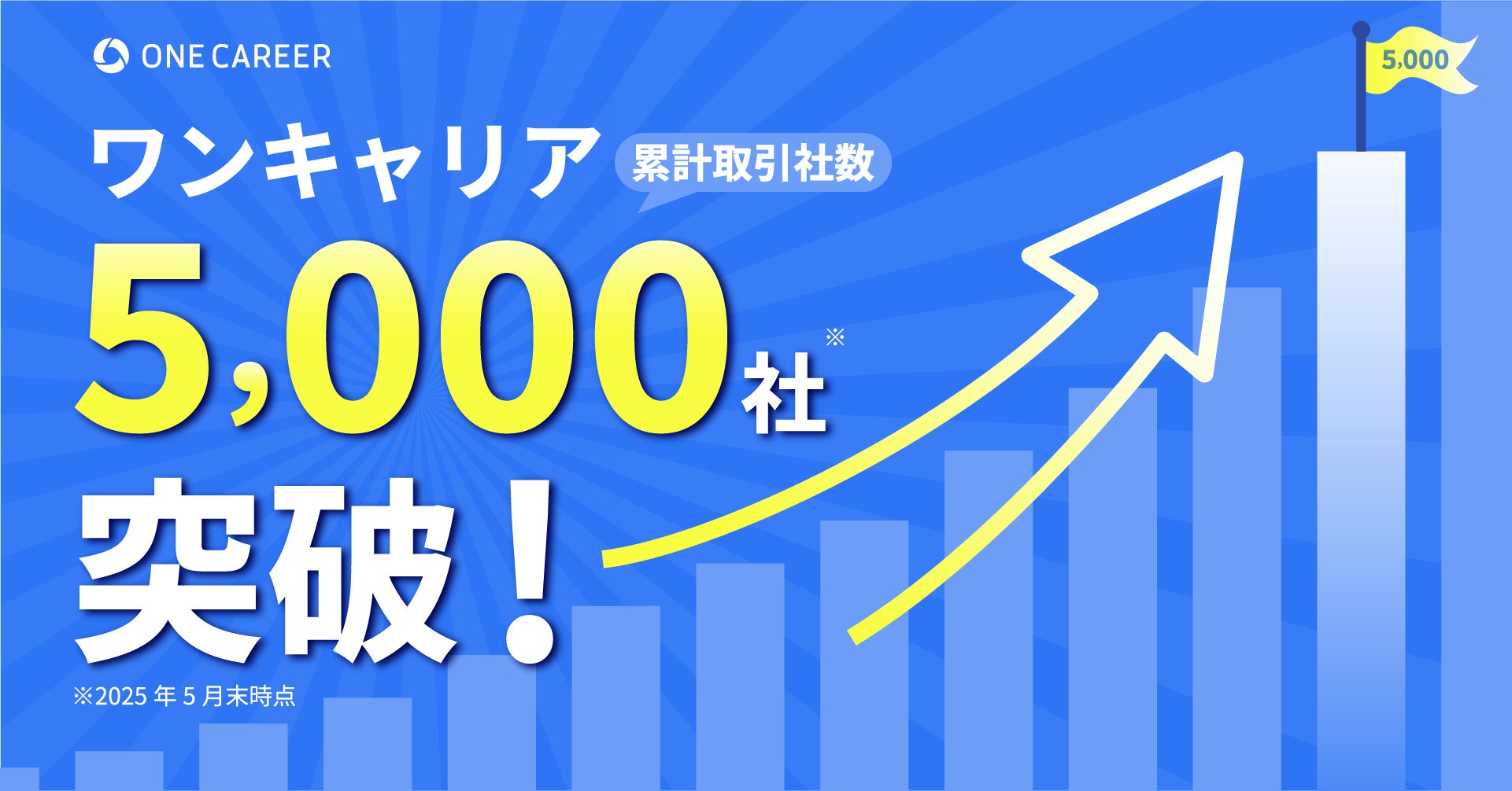 キャリアデータプラットフォーム事業を運営する株式会社ワンキャリア(本社:東京都渋谷区、代表取締役社長 執行役員CEO:宮下 尚之、以下「ワンキャリア」)は、2025年5月末時点で、創業以来の累計取引社数が5,000社[※1]を突破しました。