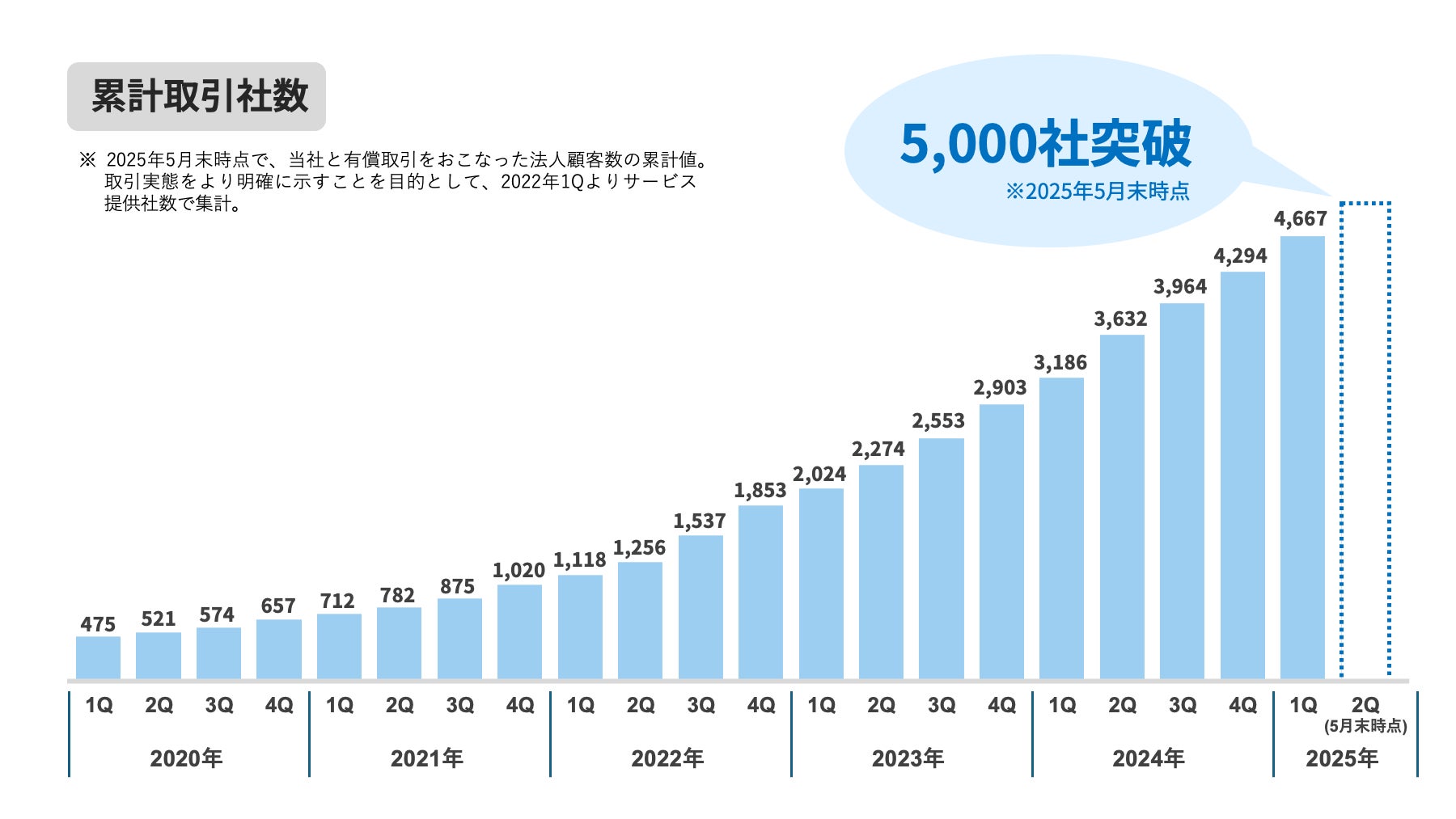 ※1 2025年5月末時点で、当社と有償取引をおこなった法人顧客数の累計値。取引実態をより明確に示すことを目的として、2022年1Qよりサービス提供社数で集計。