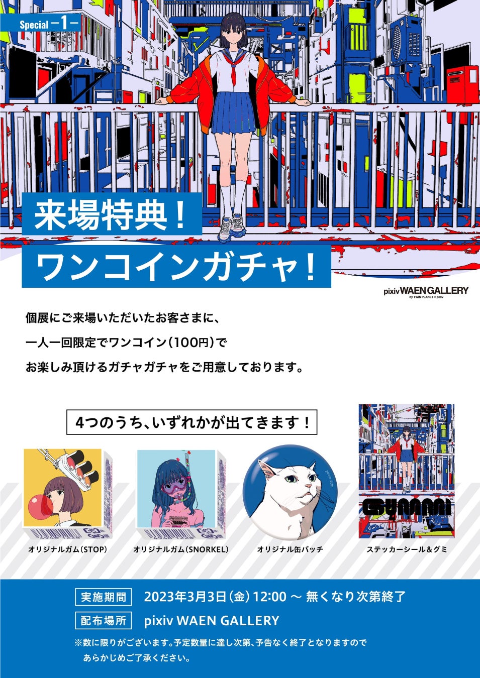 pixiv WAEN GALLERYでは厚生労働省のガイドライン等を参考にした新型コロナウイルス感染症の予防対策を行い、ギャラリーにご来場されるお客様の安全に配慮した上で営業しています。ギャラリーにご来場されるお客様におかれましては、感染防止の徹底にご理解とご協力を賜りますようお願いします。 対策について詳しくは、展示情報( https://pixiv-waengallery.com/exhibition/tarou2_gummi/ )をご覧ください。感染拡大の状況を鑑み、営業について変更が生じる場合は、pixiv WAEN GALLERY公式WEB(https://pixiv-waengallery.com/)、公式Twitter(https://twitter.com/pixivwaen)にてお知らせします。