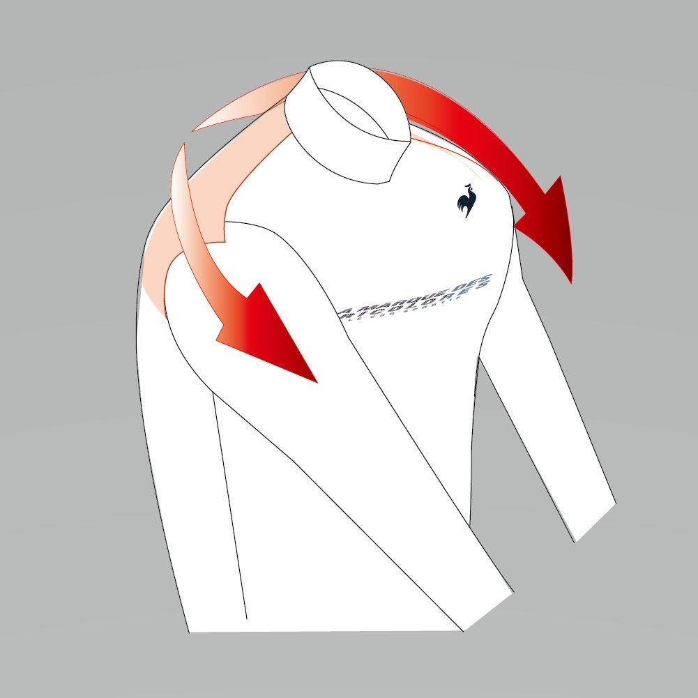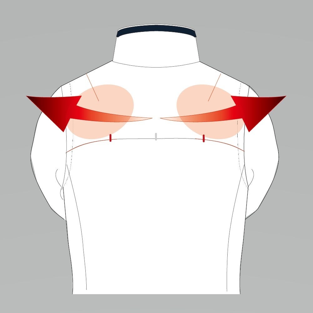 アウターは肩甲骨にゆとりを持たせるカッティングを採用。背中にいれたダーツが空間を生み、アドレス、トップ時の肩甲骨周りのつっぱり感を軽減します。