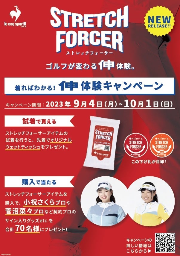 「ストレッチフォーサー」アイテムを試着や購入いただいたお客様に「着ればわかる!伸体験キャンペーン」を9月4日(月)より実施します。試着の方には先着でオリジナルウェットティッシュを、ご購入の方には抽選で小祝さくらプロをはじめとした『ルコックスポルティフ』契約プロのサイン入りグッズなどをプレゼントいたします。