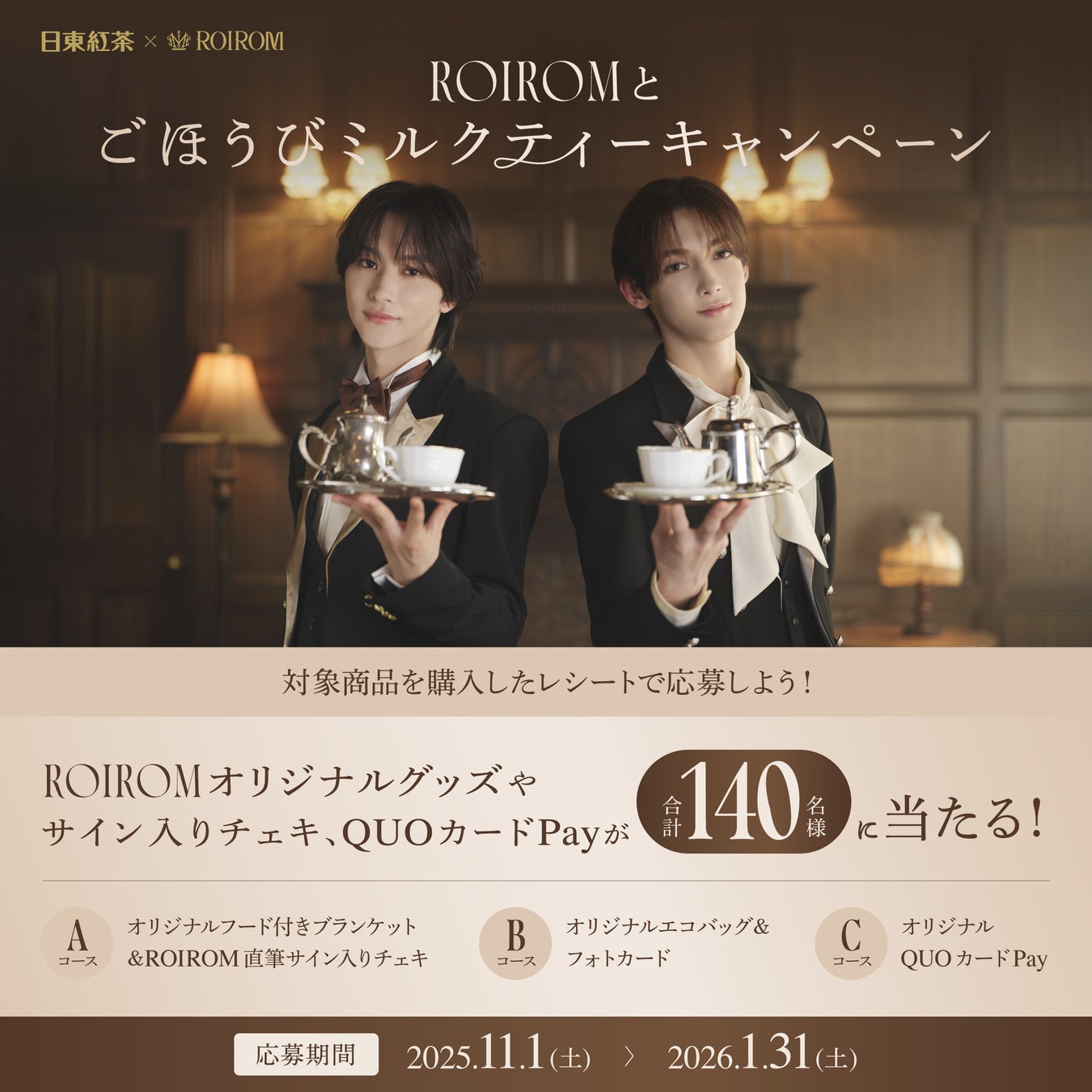 さらに、日東紅茶の「ミルクとけだすティーバッグ」シリーズ&「ロイヤルミルクティー」シリーズを購入したレシートで応募すると「ROIROM」直筆サイン入りチェキやオリジナルグッズなどがもらえる「ROIROMとごほうびミルクティーキャンペーン」も開催いたします。