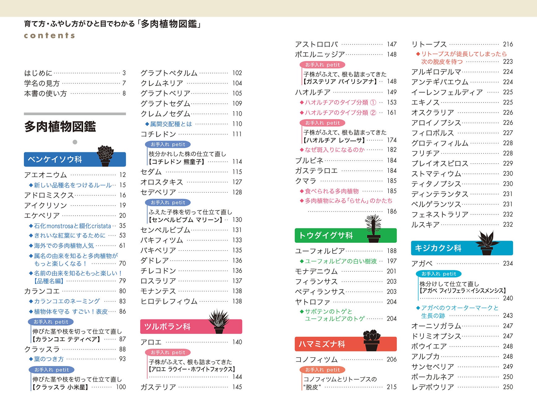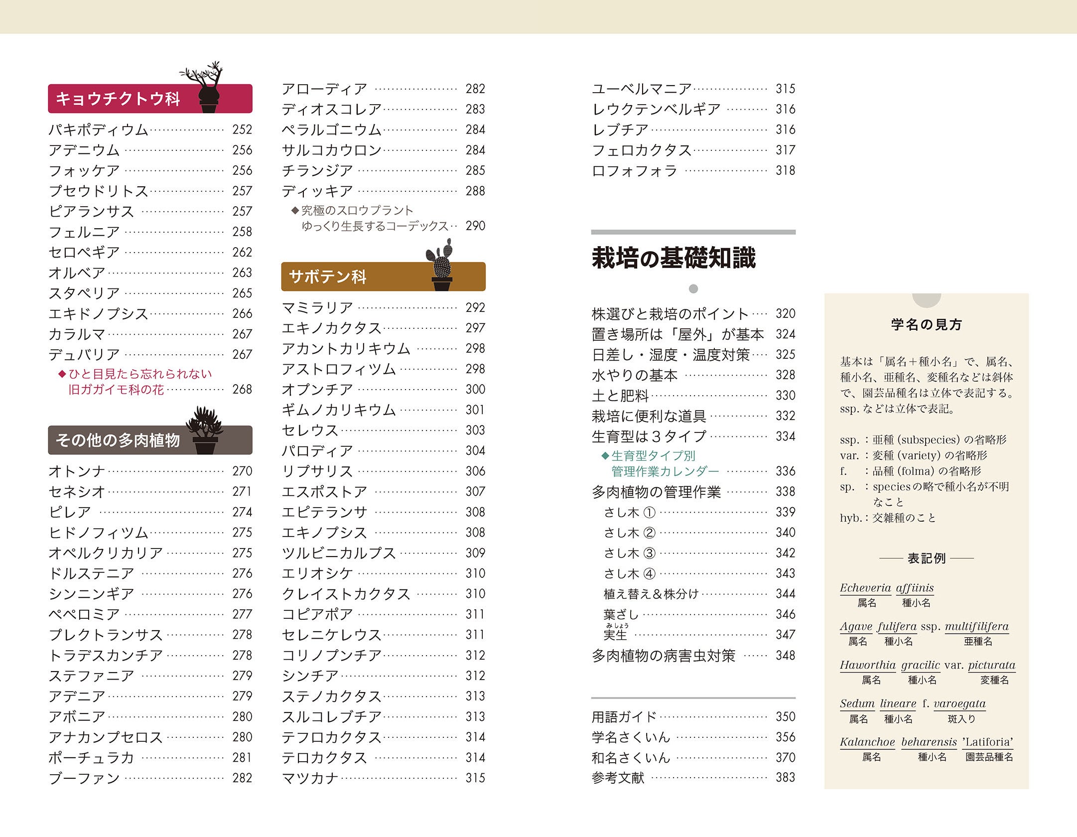 また、人気の中心も、エケベリアやハオルチアから、コーデックスやアガベに移るなど、市場もめまぐるしく変わりますが、なるべく長く使っていただけるよう、図鑑だけでなく、手入れのしかたや育て方のポイント、専門用語の解説などを掲載しました。本自体も軽くしたので、多肉植物を購入する際にもご利用いただければと思います。