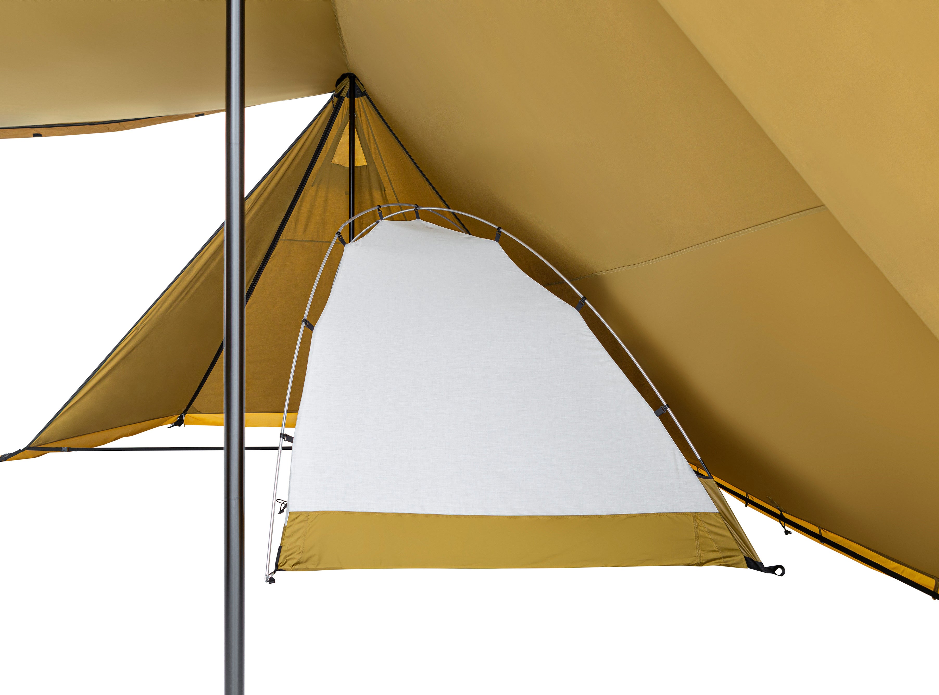 湿気を吸収して快適に過ごせるコットンポリエステルを採用したシェルター用インナーテント「テントインシェルター」は、2ポールシェルターの傾斜に合わせカンガルースタイルを楽しめるようデザインしました。前回好評だったダルゴールドシリーズの「VC 2ポールシェルター」に形も色もぴったり合います。機能性においては、コットン混紡ポリエステル素材を使用し、吸湿・通気性が抜群。また、ひとりでも設営が可能なポールポケット式を採用しました。
