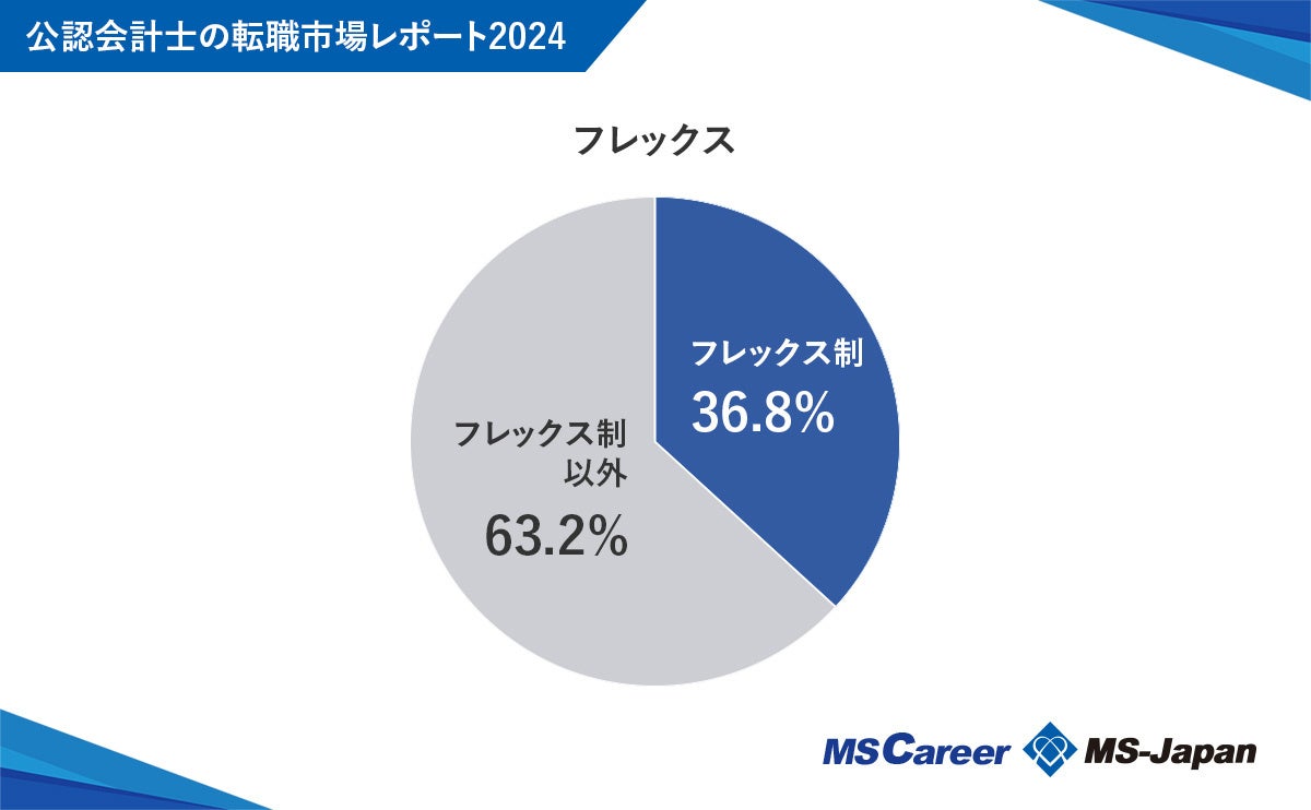 公認会計士求人における勤務時間の柔軟性を見てみると、36.8%がフレックス制という結果でした。2022年は30.7%だったため、フレックス制の求人は増加傾向にあると考えられます。