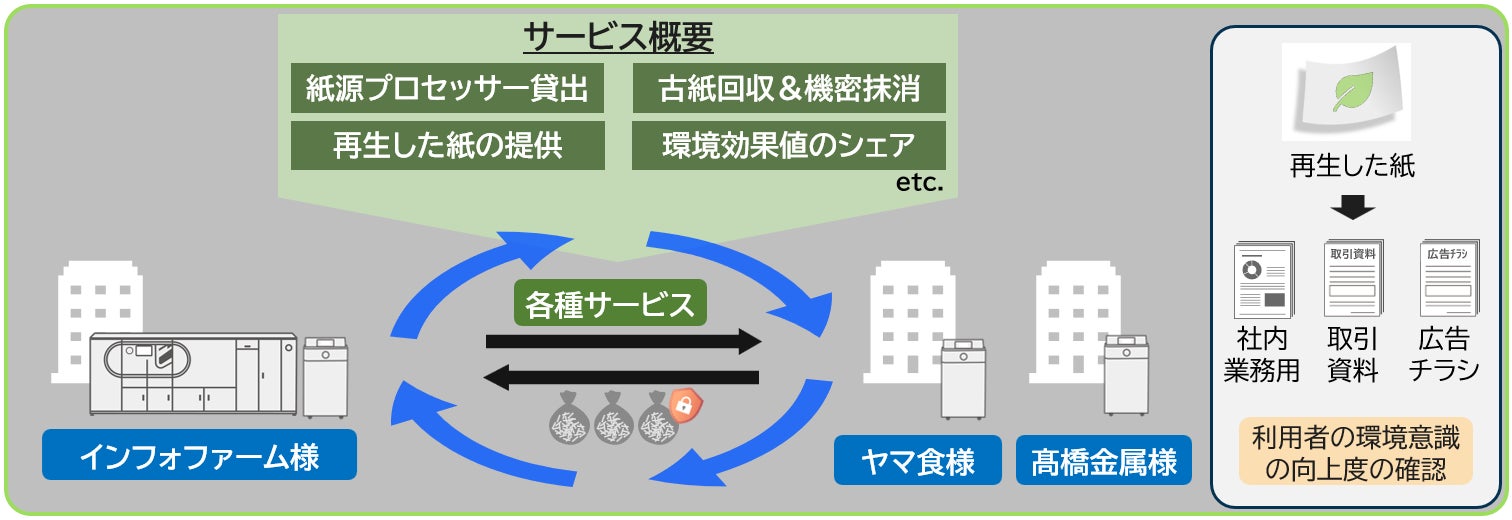 検証内容:①新型PaperLabおよび紙源プロセッサーを導入する企業が参画企業を募り、各種サービス(紙源プロセッサー貸出、再生した紙の提供など)を提供することで安定して古紙を回収するスキームの有効性