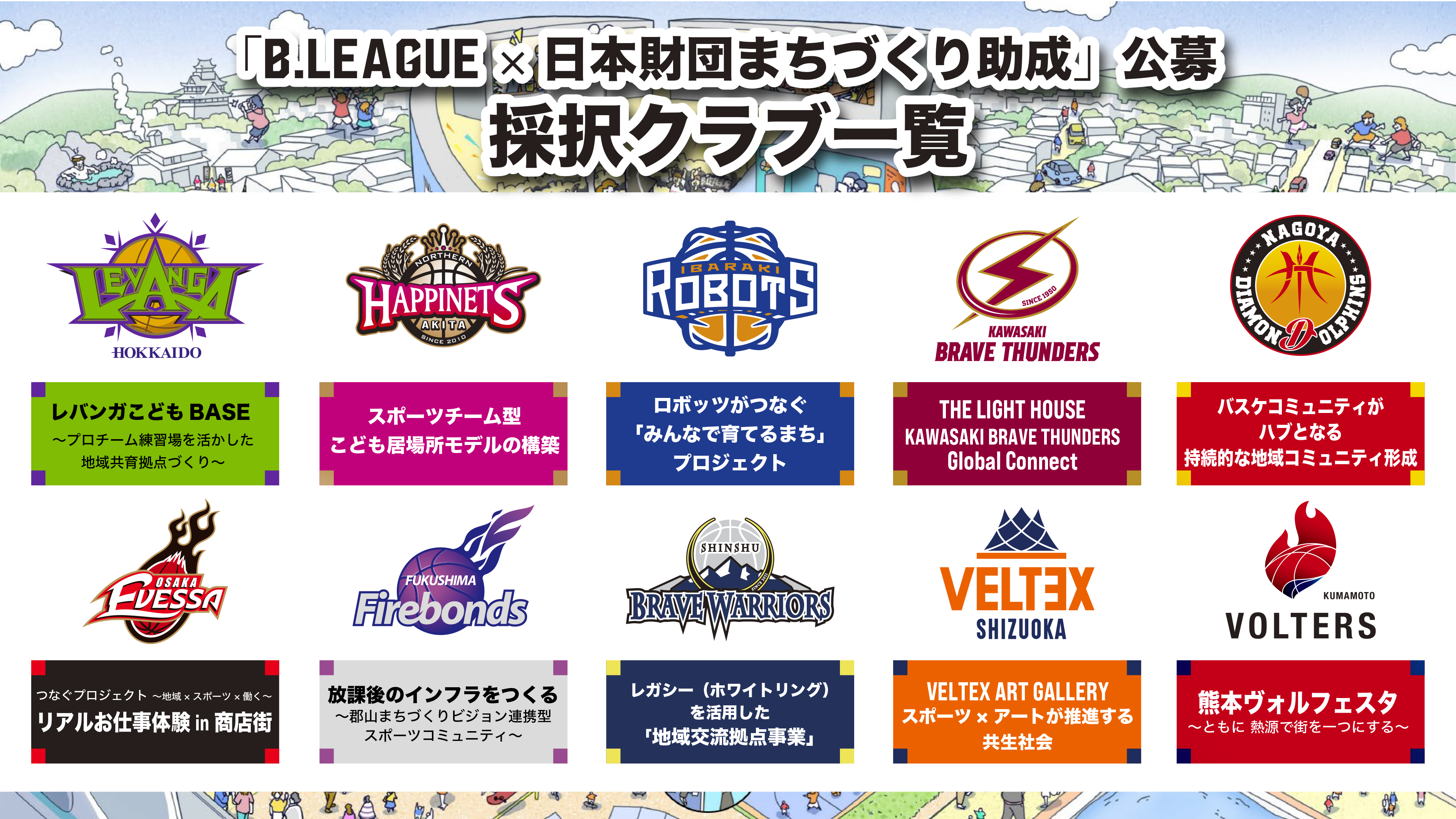 2017年1月に連携協定を締結した両者はこれまで、「B.LEAGUE Hope」の領域において、共に社会課題解決に向けて取り組んでまいりました。具体的には震災復興の支援や新型コロナ対策活動、難病児や経済的に困窮している家庭へのスポーツ体験の提供、試合観戦及び選手との交流機会の創出等で協働し、各々の強みやリソースを活かした社会的な取り組みを推進してきました。今般、地域の子ども食堂やスポーツ施設運営等、B.LEAGUE加盟クラブが実施してきたまちづくり事業の先行事例等を活かし各地に広げるため、事業提案を全国のクラブから募集。日本財団からはまちづくり事業のノウハウ提供や活動費助成で各取り組みをご支援いただき、共に社会的な活動を推進します。