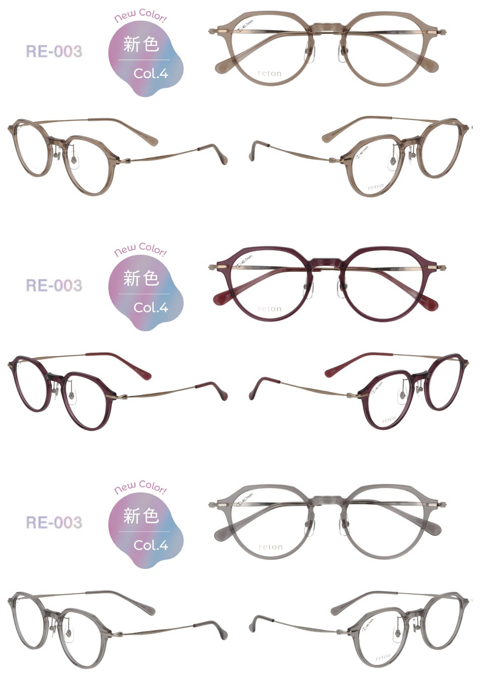 今回の新色は「reton」の特長である透明感あふれるトロガミド素材の美しさを最大限に引き出すカラーを4型、それぞれ3色ずつ展開します。12バリエーションの新たな彩りは、素材が持つ耐久性もそのままに美しい発色を長くお楽しみいただけます。