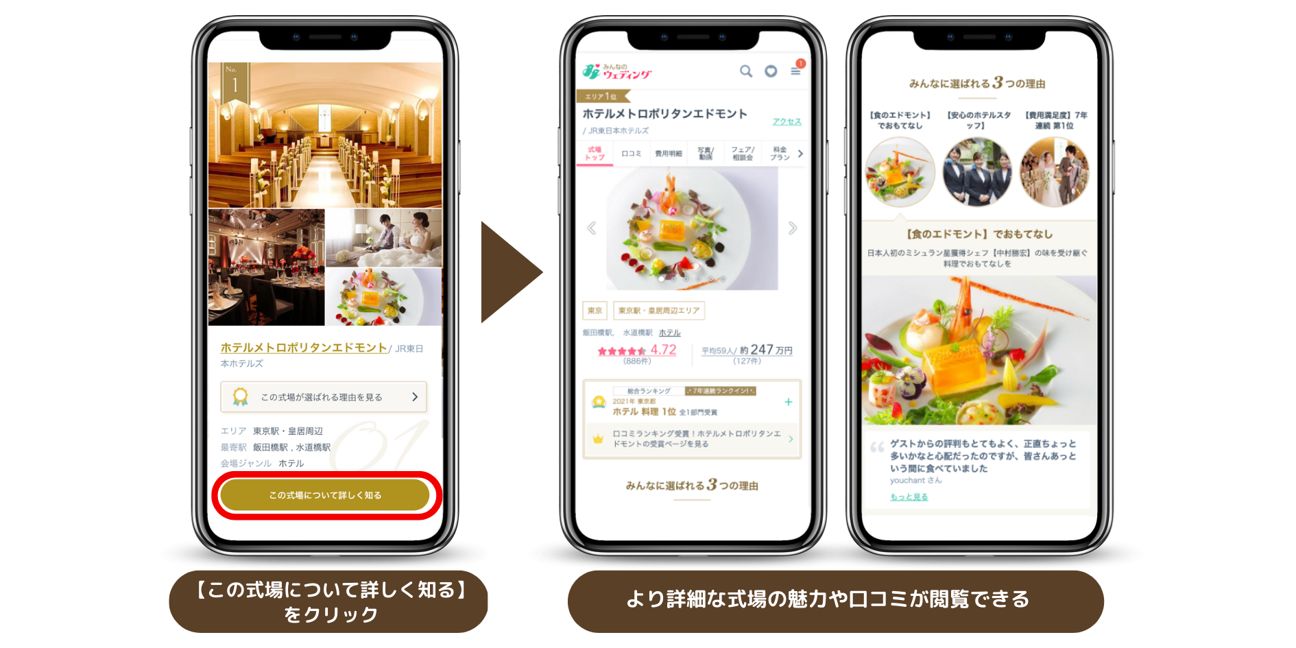 ランキングに表示された式場の【この式場について詳しく知る】をクリックすると、式場紹介ページに飛び、式場の特徴や先輩カップル、ゲストによる口コミを見ることができます。また、【この式場が選ばれる理由を見る】が表示されている式場では、より詳細な式場の魅力を見ることができ、「受賞の決め手」をはじめ、「式場スタッフのおすすめポイント」「未来の花嫁花婿さんへのメッセージ」などを、式場スタッフのコメントや『みんなのウェディング』に寄せられた口コミとともに紹介しています。
