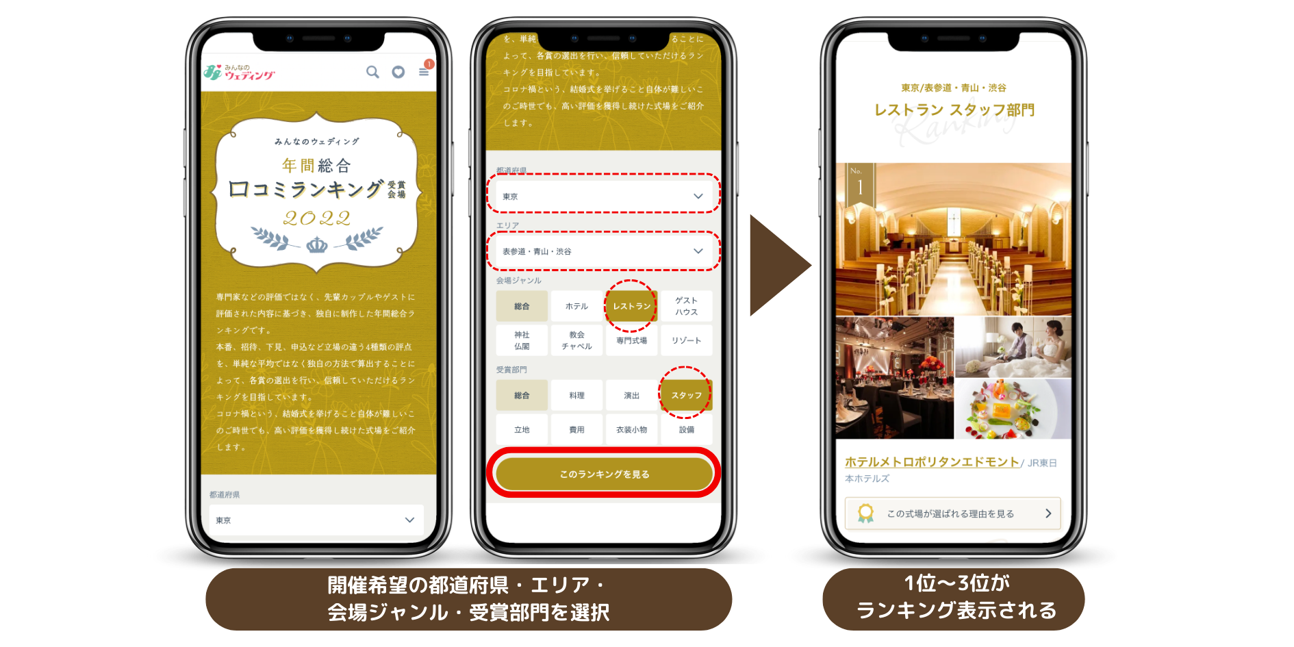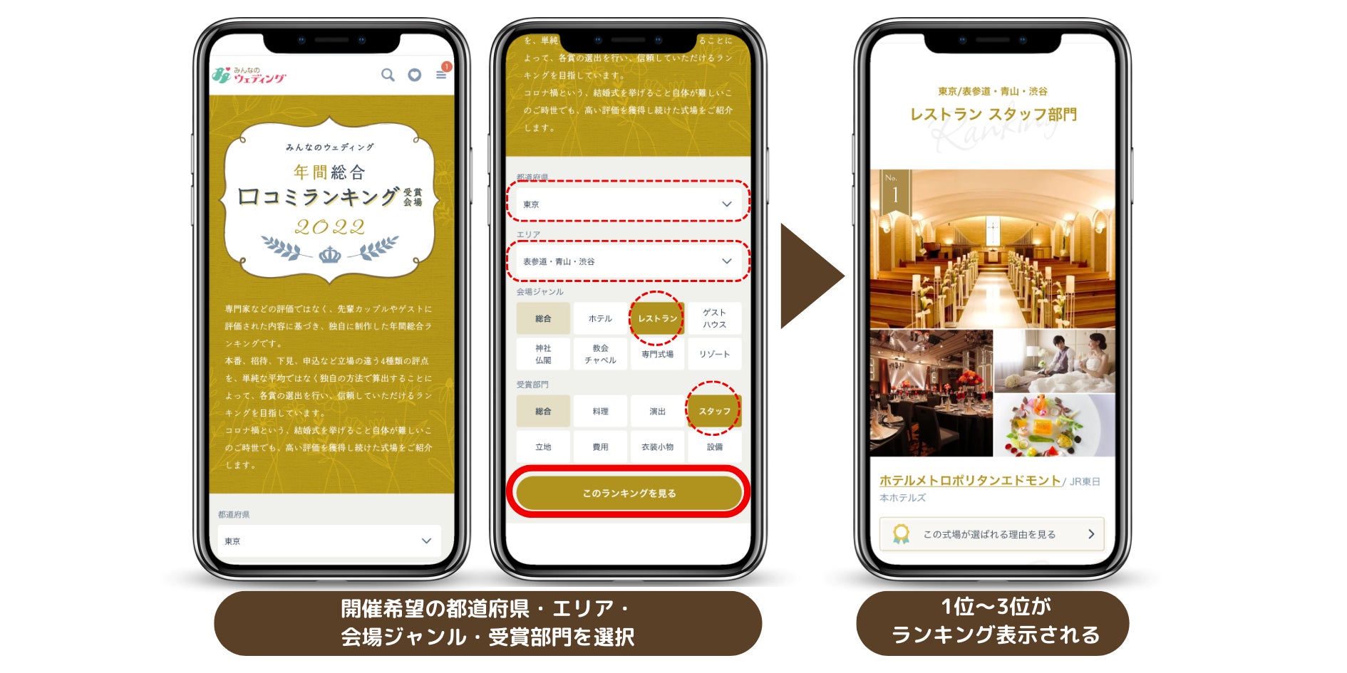 | 1. 年間を通して高い口コミ評価を集め続けた受賞会場をランキング形式で発表 2. 都道府県・エリア・会場ジャンル・受賞部門を選択すると希望に沿った会場を絞り込める 3. 【この式場について詳しく知る】から、より詳細な式場の魅力や口コミを閲覧できる |
