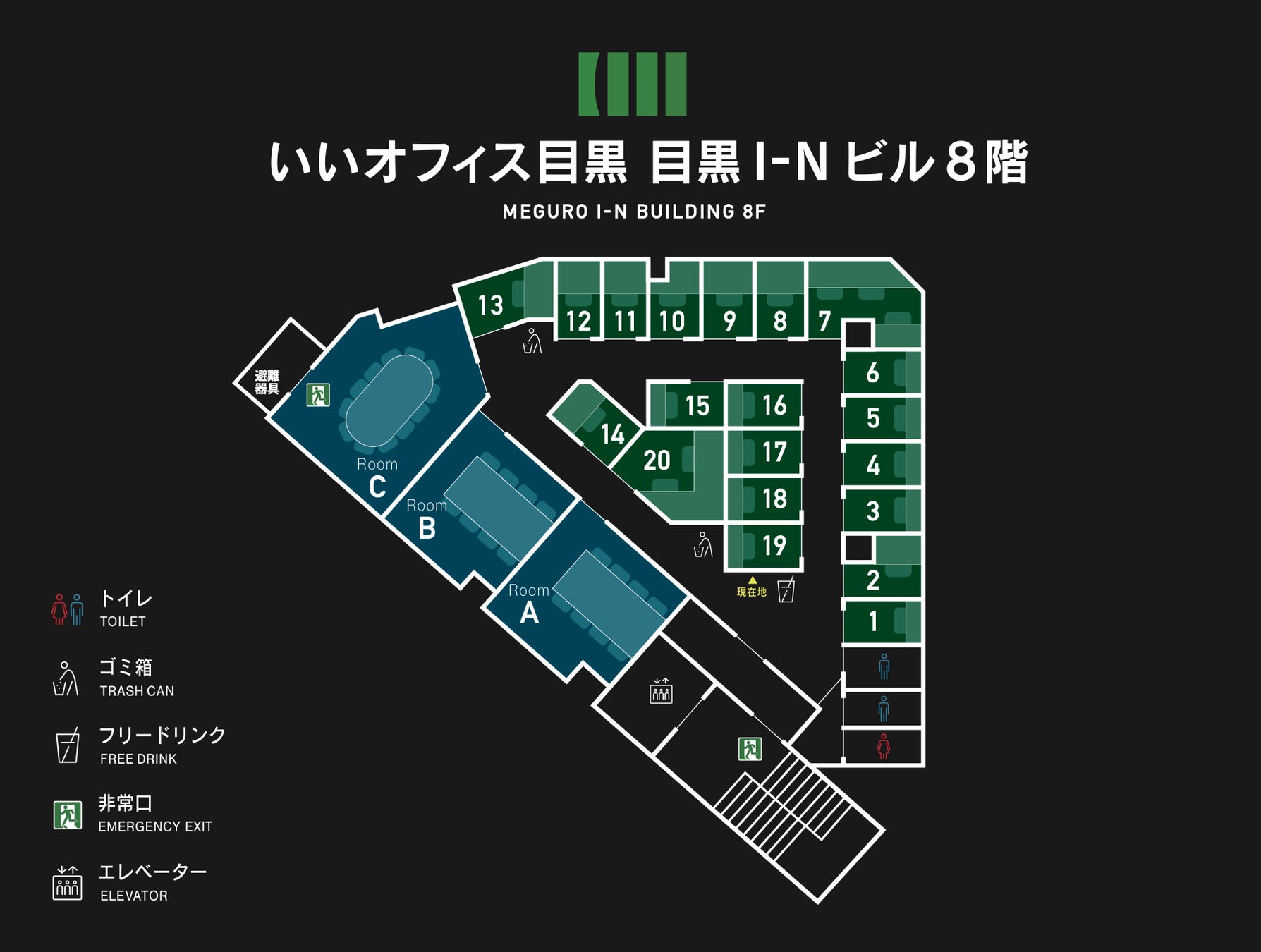 「いいオフィス目黒」は、すべて完全個室で1名用18室、2名用1室、3名用1室、6名用会議室2室、10名用会議室1室を備えたコワーキングスペースです。