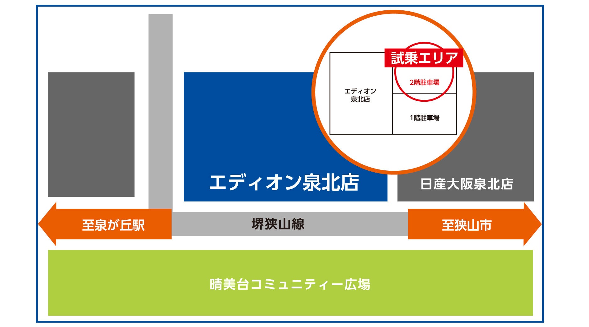 試乗の受付は、「2階駐車場スペース」にて⾏います。試乗同意書へのご署名と、ヘルメットの着⽤をお願い致します。 また、感染症対策として検温・消毒、ヘルメットを着⽤時はメッシュキャップとビニール⼿袋着⽤のご協⼒をお願い致します。なお、試乗の待機列の定員を超えた場合は、整理券を配布致します。予めご了承ください。ご試乗頂いた電動キックボードと電動バランスボードは、エディオン泉北店 2階自転車コーナーにてご購⼊いただけます。