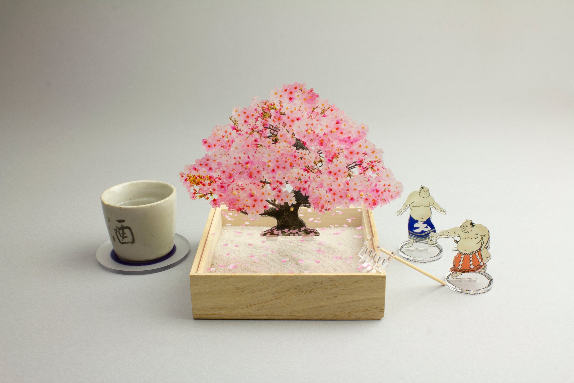 樹脂加工のプロフェッショナル集団が独自の視点で日本製品の美を見つめ直し、次世代、海外に向けて、樹脂製品との豊かな暮らしを提案するtoumeiから、透明なアクリルに色鮮やかな花びらと、木箱に敷き詰めた白砂利とのコントラストが美しい作品、「bonsai 桜」が登場。その他にも「桜」をモチーフに使用した、コースター、箸置き、キーホルダーなども販売します。