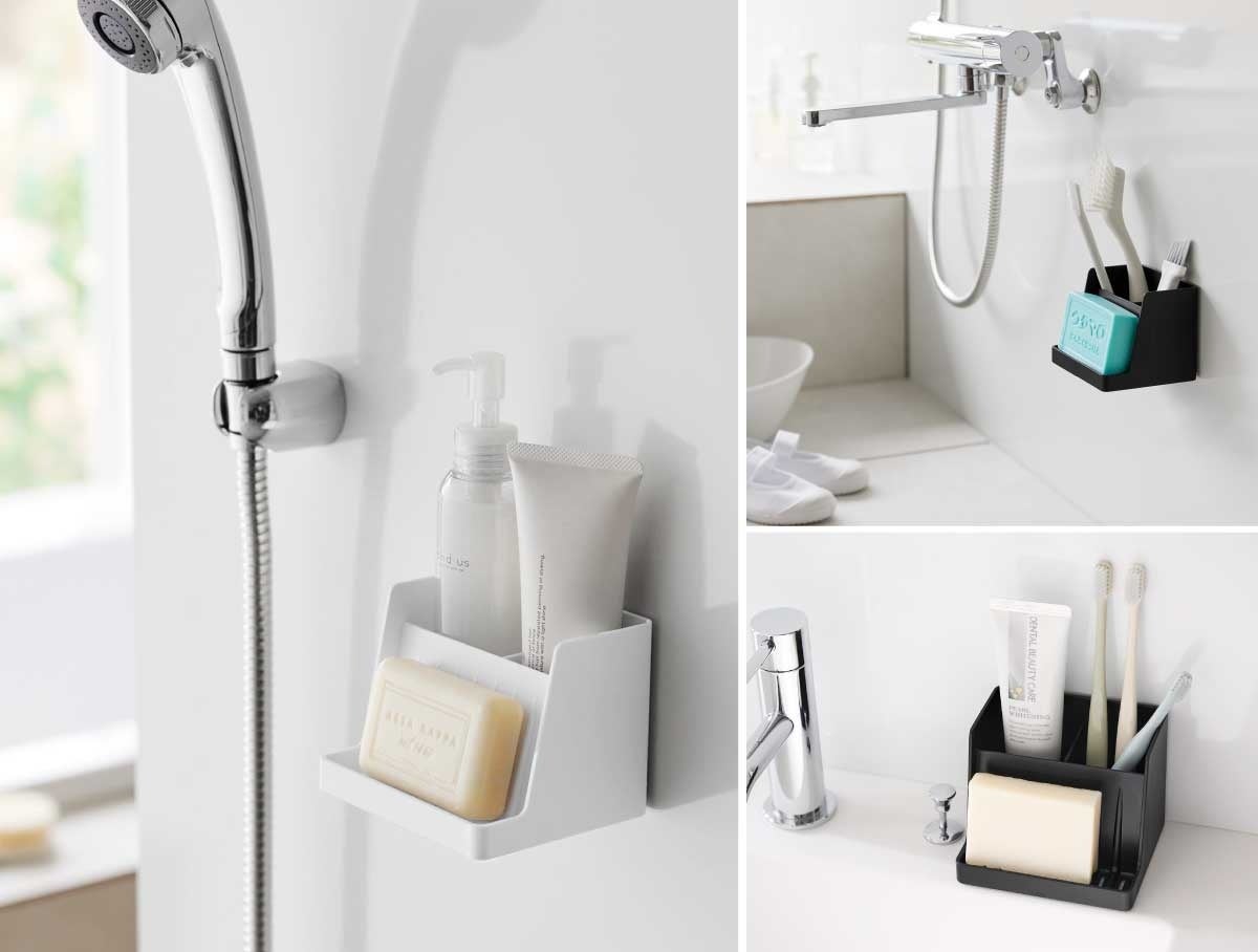 マグネットで浮かせて設置できる小物収納付きソープトレーです。