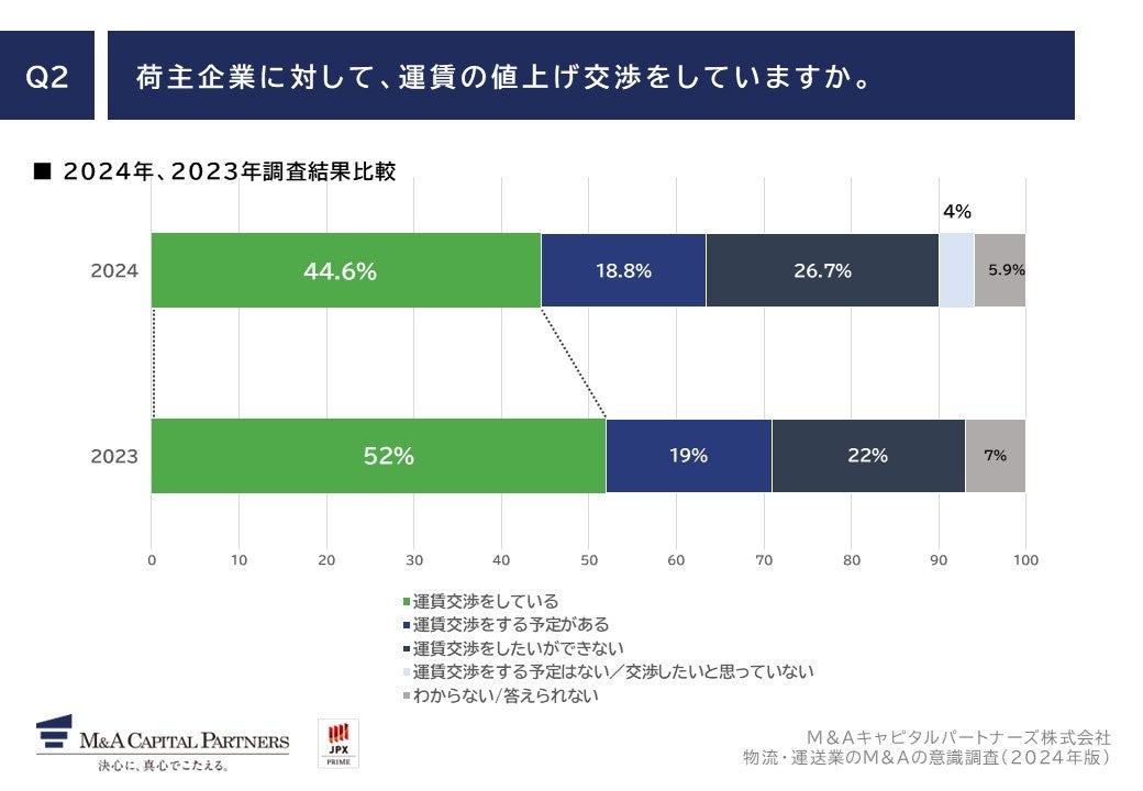 荷主企業に対する運賃の値上げ交渉、63.4%が「実施中/実施予定」と回答、2023年から7.6ポイントダウン
