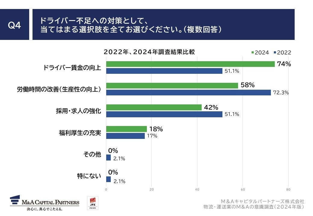また、25.7%が、2024年問題に伴うドライバー不足への対策を「すでに実施」していますが、ドライバー不足への取り組みとしては、第1位「ドライバー賃金の向上」(74.0%)、第2位「労働時間の改善」(58.0%)となり、2022年調査から上位が入れ替わる結果となりました。